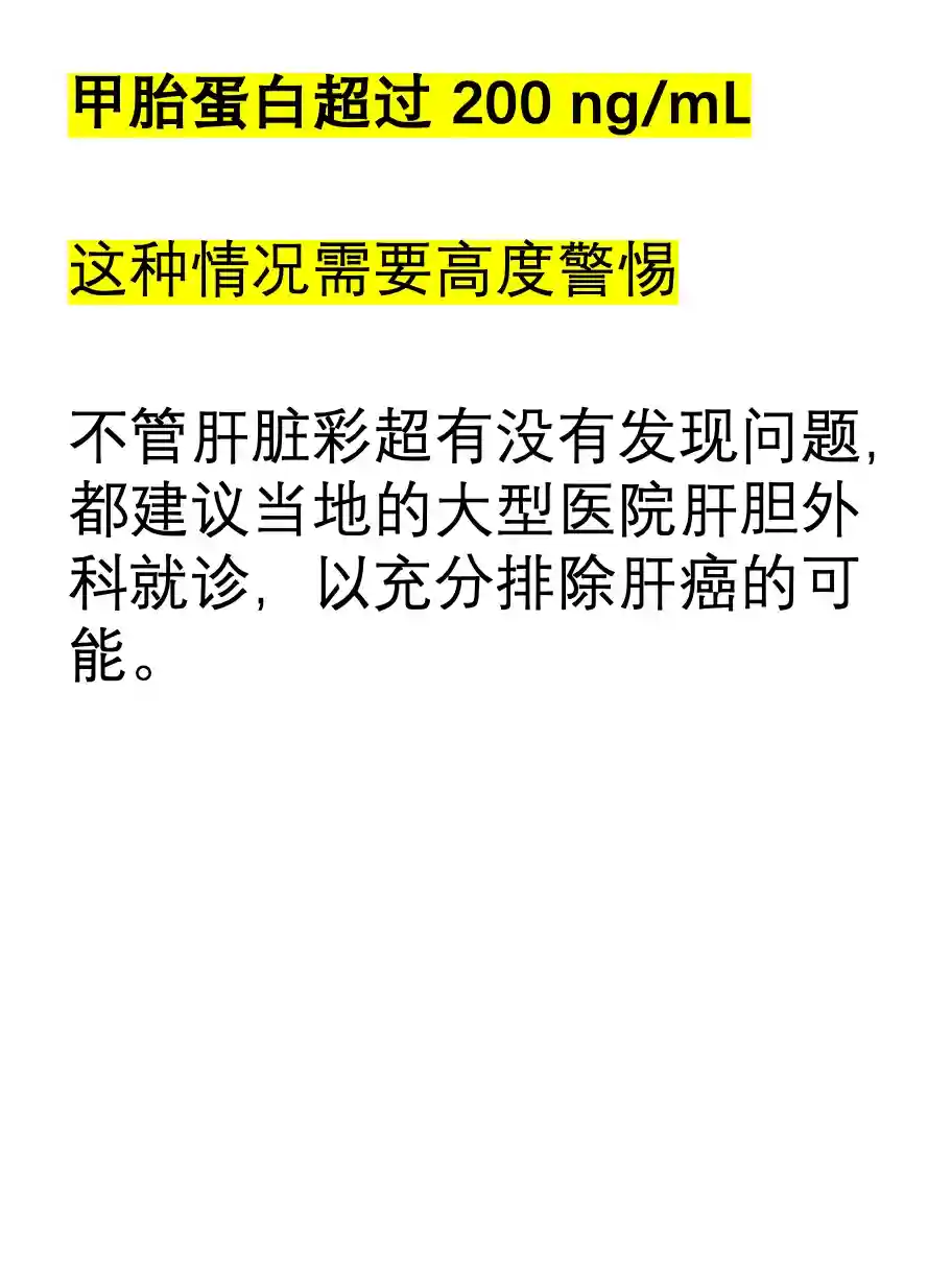 • 甲胎蛋白超过 200 ng/mL。 不管肝脏彩超有没有发现问题,都建议当地的大型医院肝胆外科就诊,以充分排除肝癌的可能。对于一些特殊人群,甲胎蛋白升高需要提高警惕。 如果同时存在基础肝病,包括乙肝携带者、丙肝感染或者各种原因引起的肝硬化的患者,在发现甲胎蛋白超过 20 ng/mL 后,需要高度警惕肝癌的可能。但如果患者处于肝炎活动期,同期的肝功能发现有谷丙转氨酶(丙氨酸氨基转移酶,GPT/ALT)或者谷草转氨酶(天门冬氨酸氨基转移酶,GOT/AST)升高,这期间的肝细胞修复也会导致甲胎蛋白的轻度升高,但这种情况下甲胎蛋白通常不会超过 200。