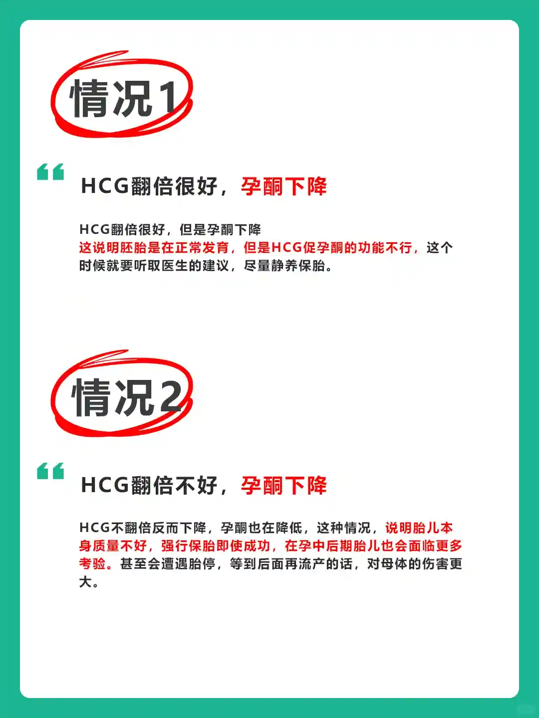🌟🌟孕酮正常,HCG翻倍“绝*对”不好:数值在一个区间,比如说8天,只翻了一倍,就属于情况不好。 排除宫外孕的因素,大概率是胚胎出现了问题,现在很多医院只补充孕酮,很少补充HCG。