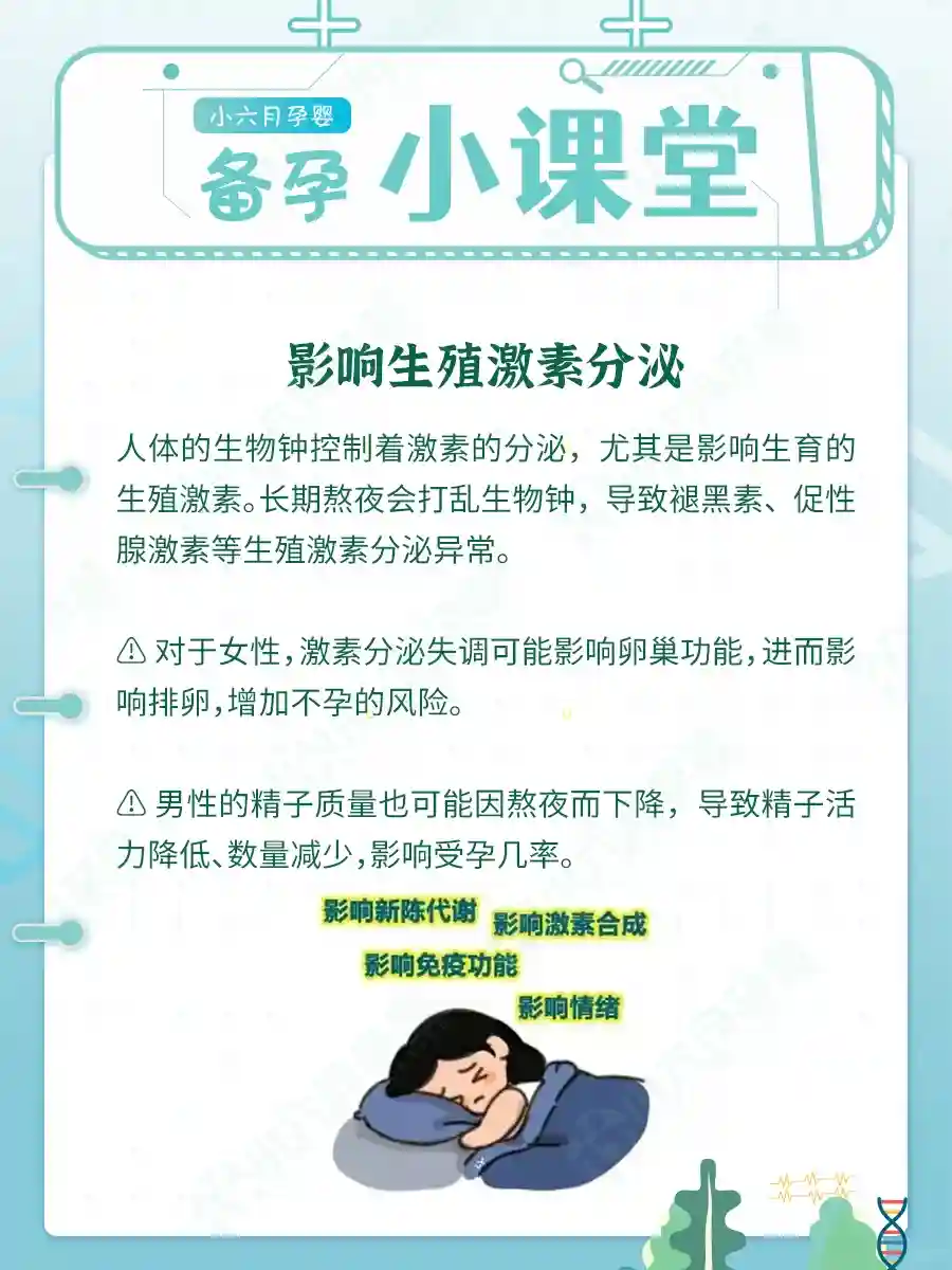 人体的生物钟控制着激素的分泌,尤其是影响生育的生殖激素。长期熬夜会打乱生物钟,导致褪黑素、促性腺激素等生殖激素分泌异常。