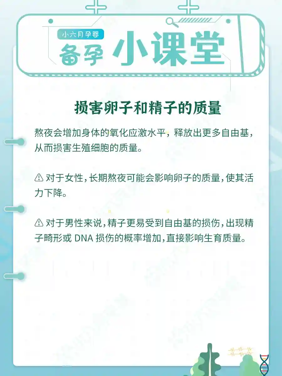 熬夜会增加身体的氧化应激水平,释放出更多自由基,从而损害生殖细胞的质量。
