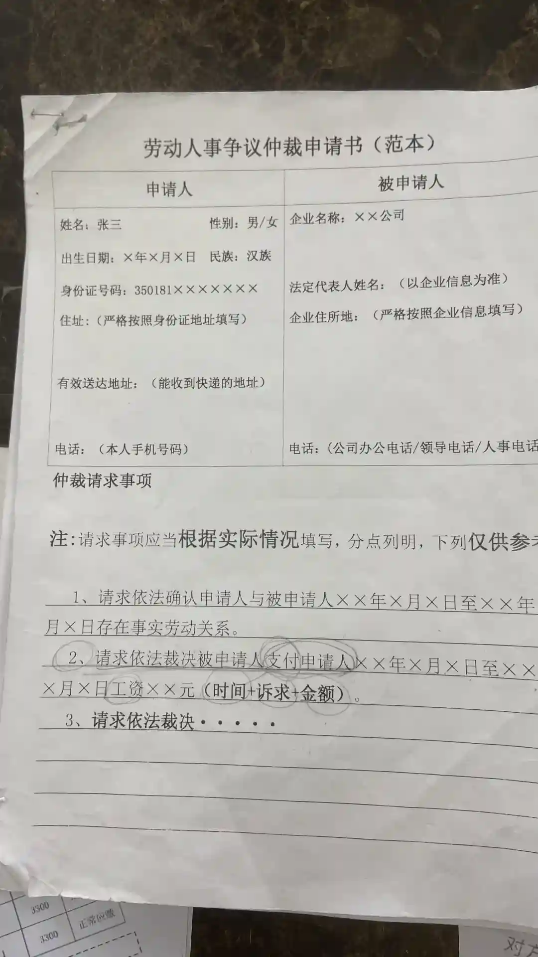 因为要从福州开车去福清,来回不方便,故去之前,记得问询需要哪些材料?做到只跑一次,当天提交申请就能材料齐全,故当然资料越多越好,这样胜诉概率会提高,至少要有基础资料:申请人信息(身份证),被申请人信息(营业执照),其余材料根据仲裁的诉求来增补,比如要处理工伤的仲裁,就要工伤鉴定,住院费用明细,病例,后期康复护理费用等,像我是被违法劝退,我提交过去在职5月到11月的工资明细(最好银行柜台打印),个人所得税缴纳明细,企业微信岗位信息,医保社保等缴纳记录(从闽政通上下载的缴纳记录,入职就要缴纳医社保,谷丰源为了少交,从4月29日试岗到7月31日都没缴纳,这次仲裁也申请,让对方补交),劳动合同复印件,以上材料都要一式二份。3️⃣从福州祥谦到福清宏路的高速过路费是13元,不贵,10点20分到福清台商大厦,12层4号柜台的小姐姐今天已经受理5份劳动仲裁,看样子年底,仲裁增加不少。检查了我的资料,说申请要按她们格式调整了,所有附件资料,都要写到她们的格式清单中,拿到她们的模版,按格式填写,期间修改多次,可以直接涂改,到时候按手印就可以。