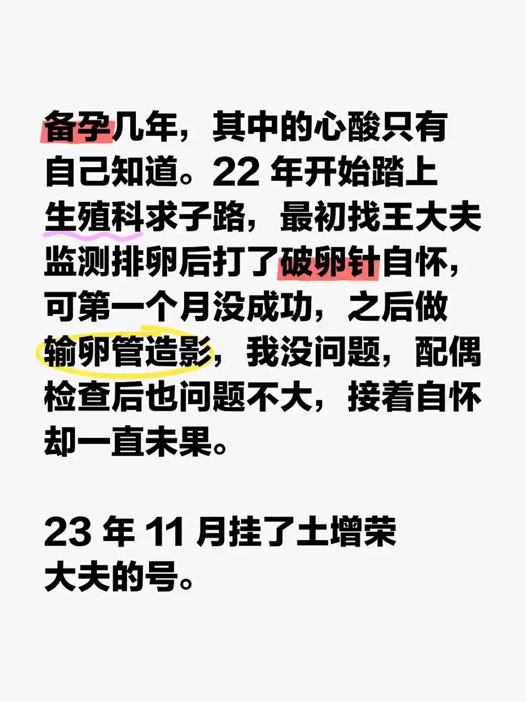 23 年 11 月挂了土增荣大夫的号。第一次就诊,土大夫让找之前输卵管片子并生理期第二三天来监测卵泡,结果我听错时间,在生理期结束两三天才去,只能在自身卵泡上促排。输卵管片子显示通而不畅,拿了中药喝一周,连着促排几次,排卵期打了破卵针后开奖失败。