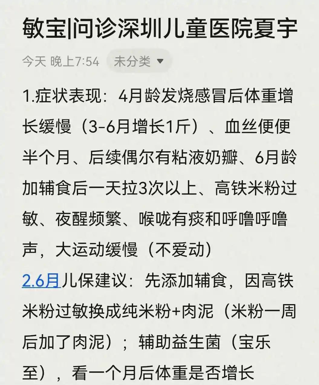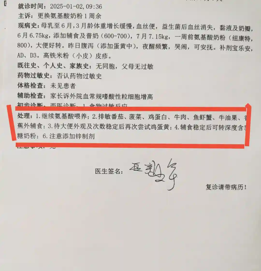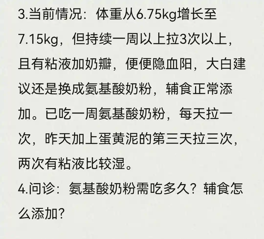 氨基酸奶粉吃了一周了,第七天吃蛋黄吃的多一些结果拉了三次,看来蛋黄得暂时回避;夏宇觉得既然上了辅食那奶粉就要降低到最安全的程度,所以只有两种情况下可以转奶,一种是完全不爱吃了,奶量又降下去了;另一种是基本上大类辅食都稳定了,没再出现腹泻之类的,可以慢慢转奶。整体来说是常见过敏回复,自己做的功课也差不多