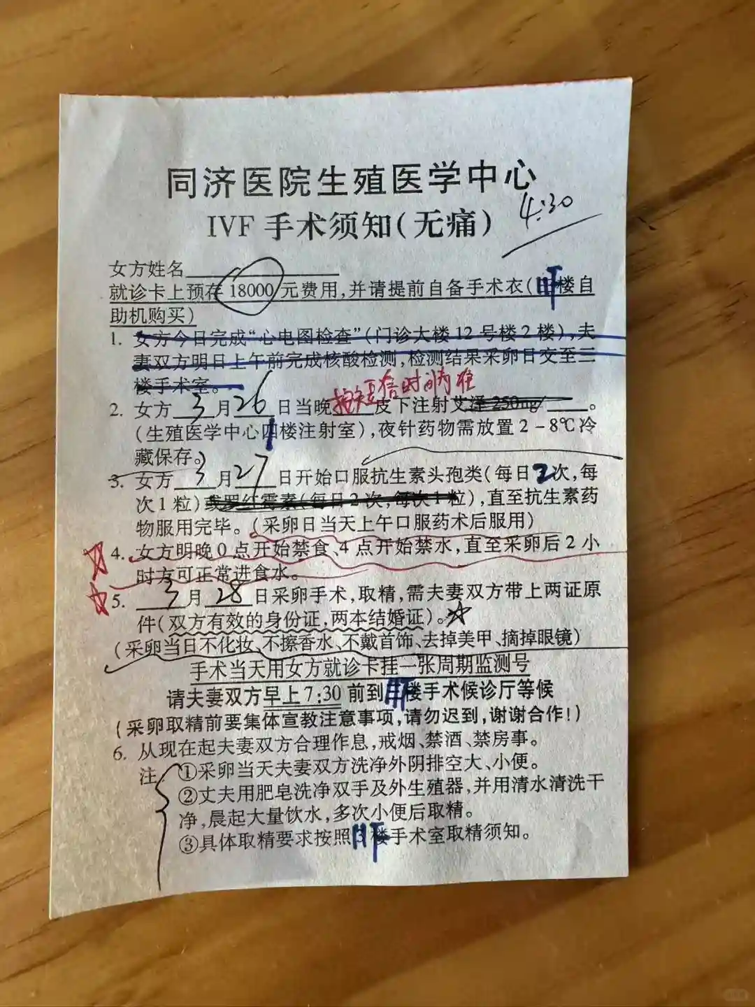 第四步“取卵手术”;“取卵手术”是在“夜针”后36小时,也就是隔天早上7:00得到医院手术室;医生会在群内通知,发一些术前、术后的一些注意事项;