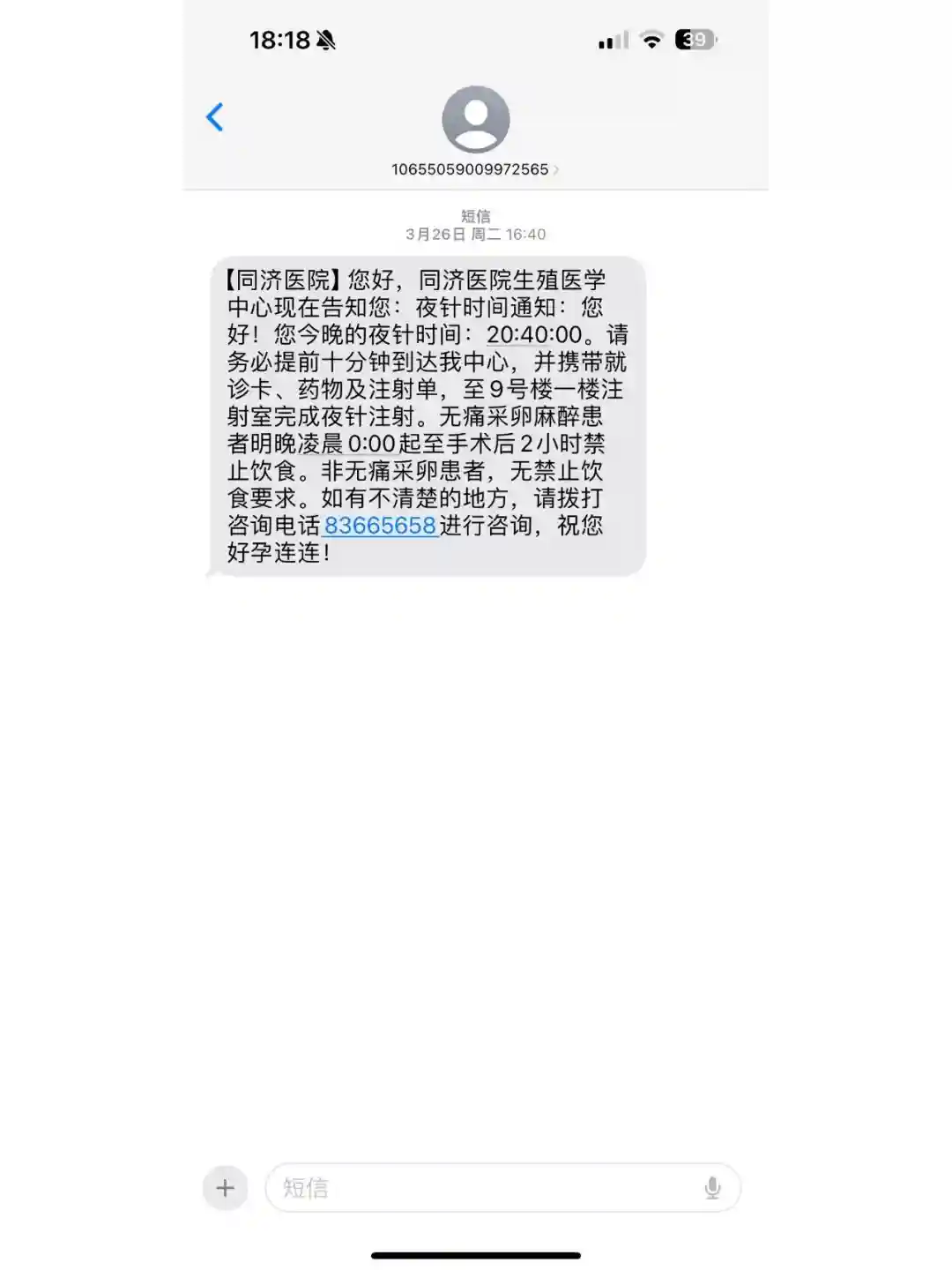 第三步“打夜针”,在打完手上所有的“果纳芬”和“尿促性素”后,做完B超,医生告诉我,当天晚上可以打“夜针”了;让我加入到当天的“夜针”微信群里,并且在下午收到了同济医院发来的短信,通知我晚上8:40打夜针,提前半小时到医院排队;同样在这天,医生和我确认是否要打麻醉,并且告知我需要在“取卵手术”前,预存18000元到医院就诊卡上;我之前在“小红书”上查到姐妹们对取卵手术的反馈,果断选择了“全麻”,事实证明这个选择是多么正确;