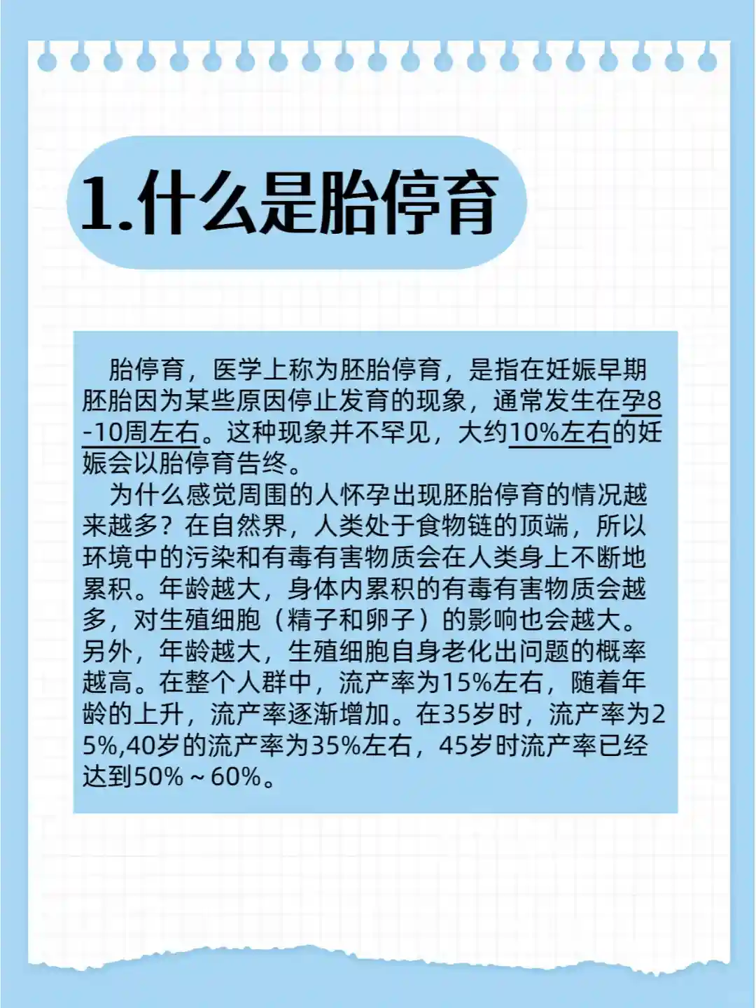为什么感觉周围的人怀孕出现胚胎停育的情况越来越多在自然界,人类处于食物链的顶端,所以环境中的污染和有毒有害物质会在人类身上不断地累积。年龄越大,身体内累积的有毒有害物质会越多,对生殖细胞(精子和卵子)的影响也会越大。另外,年龄越大,生殖细胞自身老化出问题的概率越高。在整个人群中,流产率为15%左右,随着年龄的上升,流产率逐渐增加。在35岁时,流产率为25%,40岁的流产率为35%左右,45岁时流产率已经达到50%~60%。