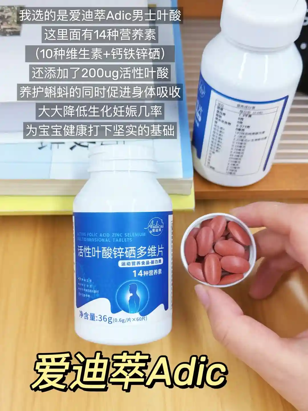 我选的是爱迪萃Adic男士叶酸,这里面有14种营养素(10种维生素+钙铁锌硒),还添加了200ug活性叶酸,养护蝌蚪的同时促进身体吸收,为宝宝健康打下坚实的基础。