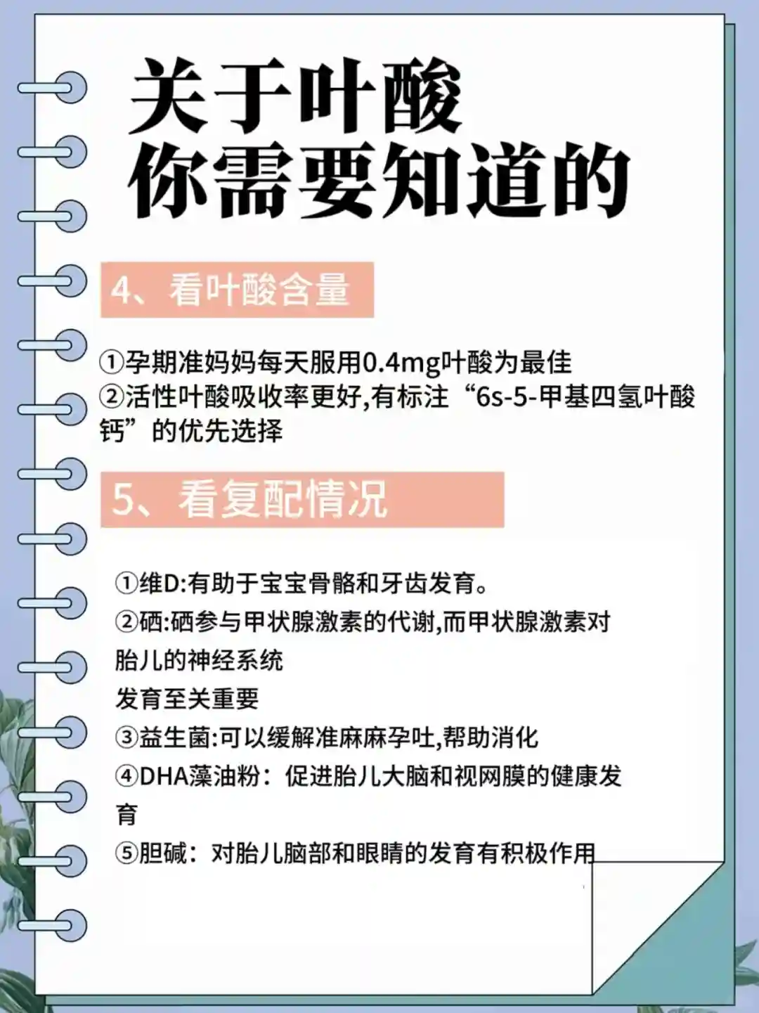 1. 看叶酸含量:确保叶酸补充剂含有孕妇每日推荐摄入量,通常是400-800微克。