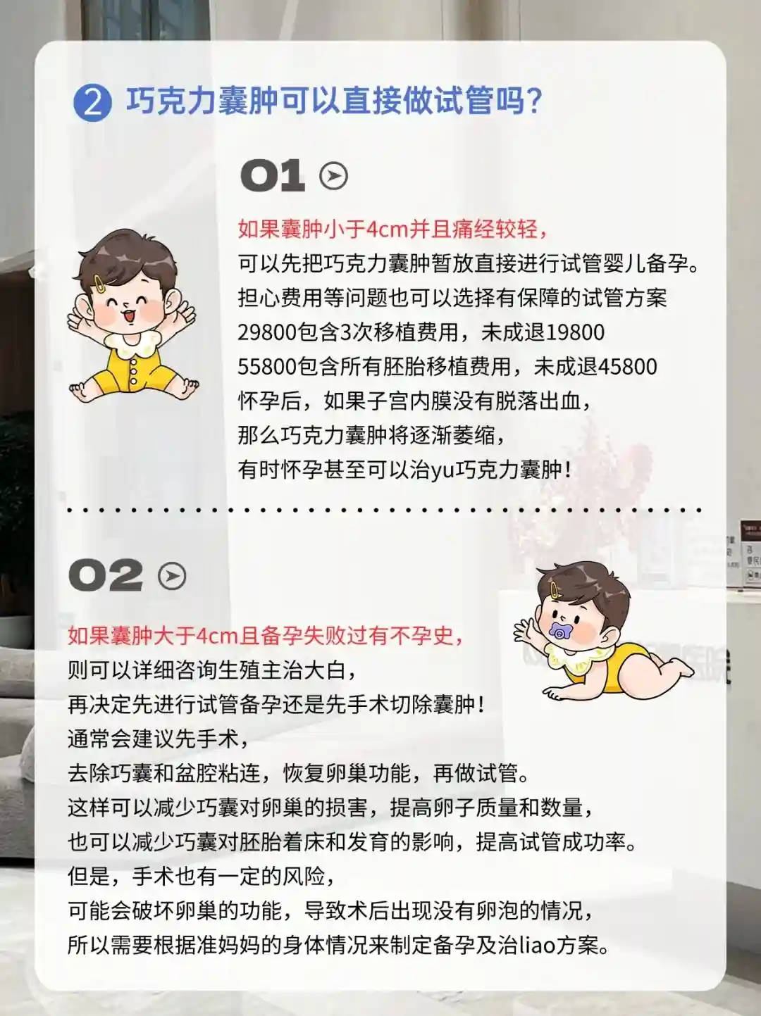 🔺如果巧克力囊肿较大(大于4cm),症状较重,有不孕病史,建议先手术,去除巧克力囊肿和盆腔粘连,恢复卵巢功能,再做试管婴儿。