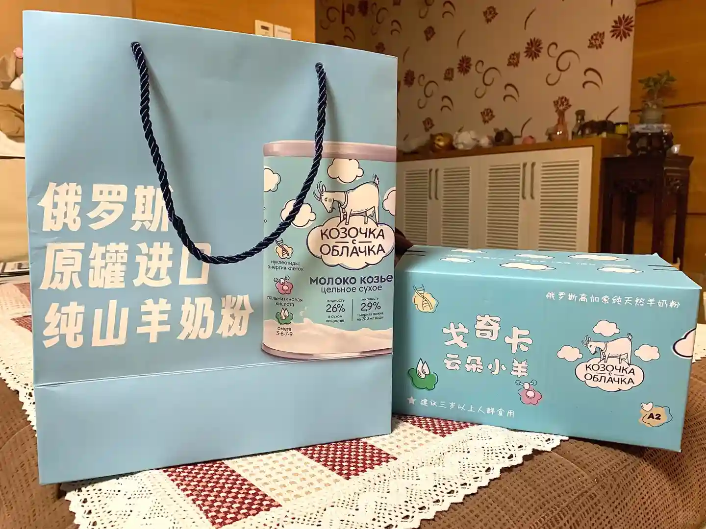 喝完了一袋350g的,想试试别的牌子,刷到了这款俄罗斯进口的山羊奶粉,完全被包装折服,太好看了吧!而且买两罐还送搅拌杯,还有礼品袋,明信片,马上下单!