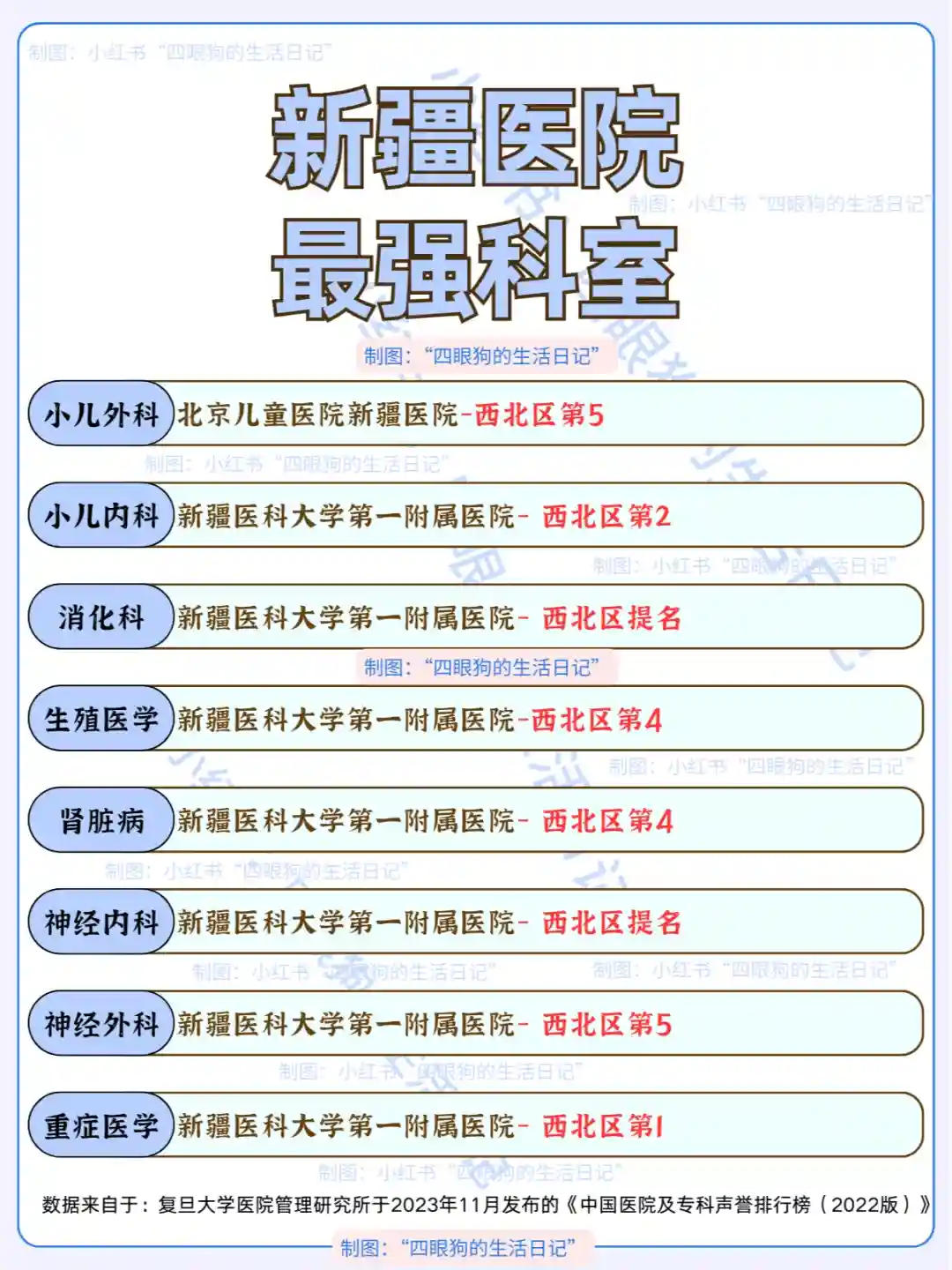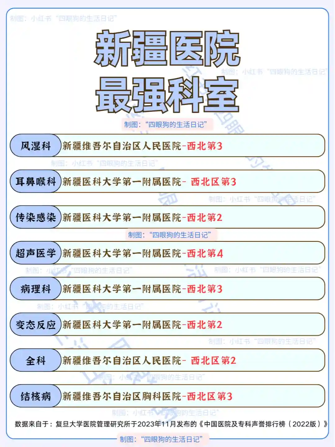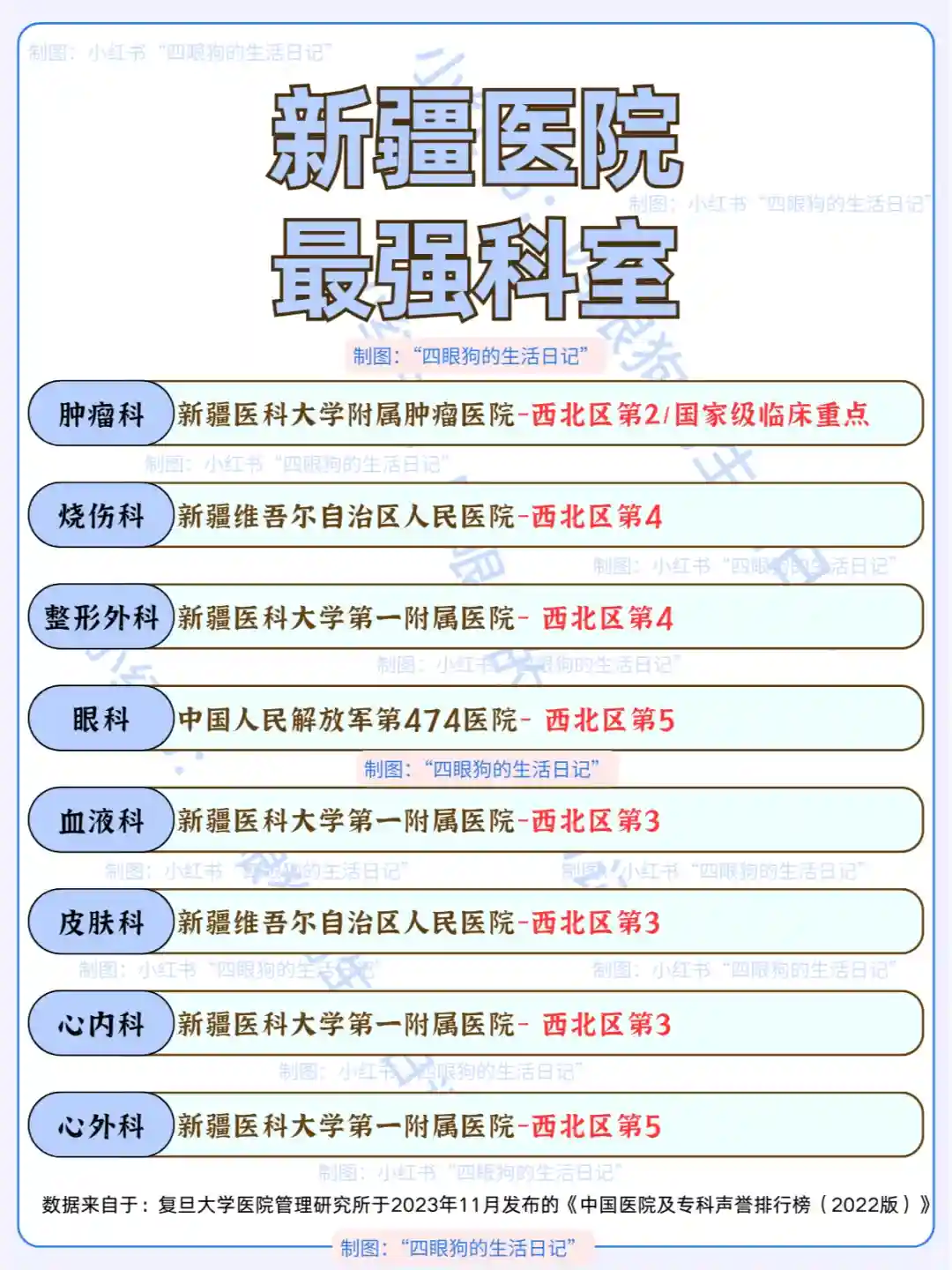 根据复旦大学医院管理研究所于2023年11月发布的《中国医院及专科声誉排行榜(2022版)》来看,在新疆维吾尔自治区内,各科室排名最前的医院如上图所示,省流版如下:
