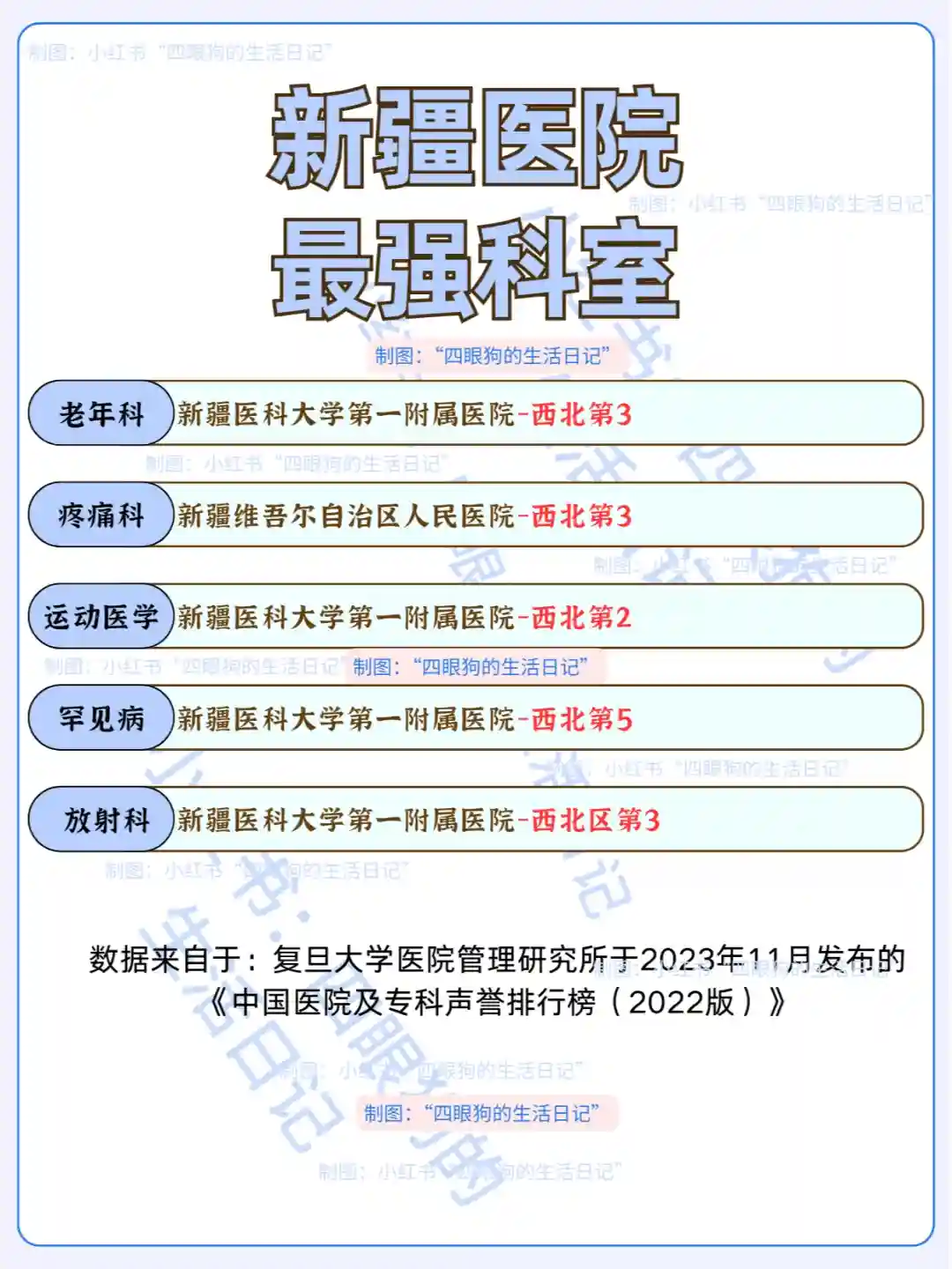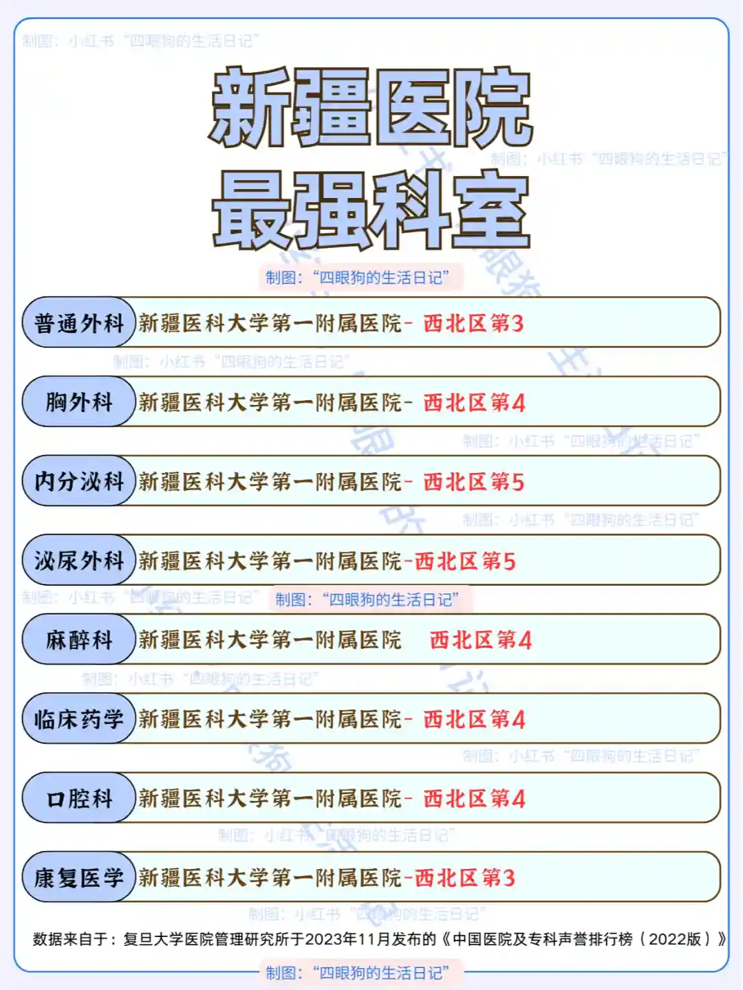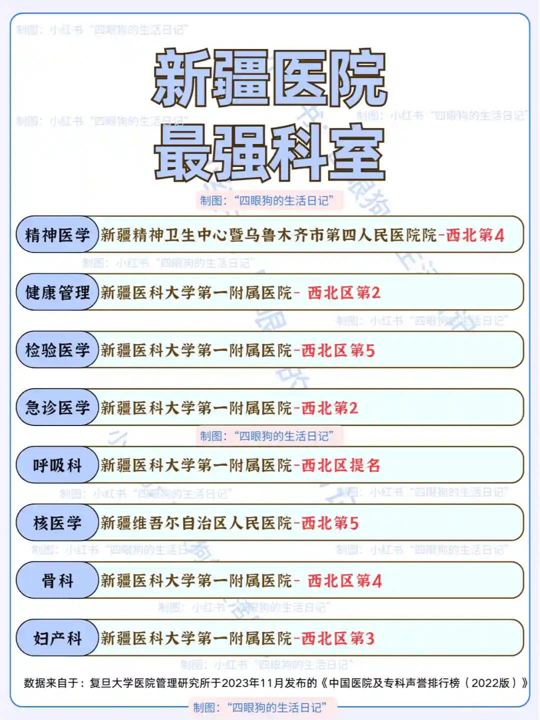 根据复旦大学医院管理研究所于2023年11月发布的《中国医院及专科声誉排行榜(2022版)》来看,在新疆维吾尔自治区内,各科室排名最前的医院如上图所示,省流版如下: