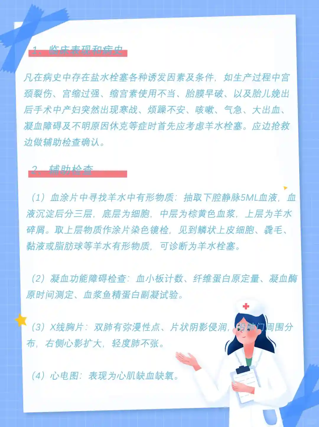 上述的典型症状未必所有患者均有,因此,对表现寒战、胸闷、微咳或呛咳的呼吸困难、面色苍白、出血而血不凝的患者,应高度警惕羊水栓塞的发生‼