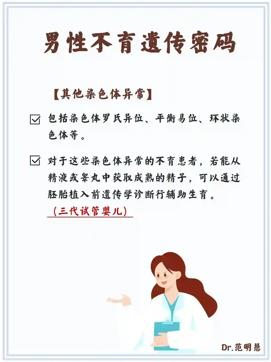 包括染色体罗氏异位、平衡易位、环状染色体等。对于这些染色体异常的不育患者,如果能从精液或睾丸中获取成熟的精子,可以通过胚胎植入前遗传学诊断行辅助生育。