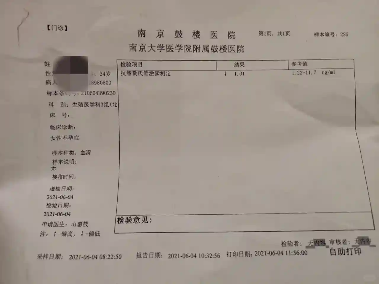 这次在南京两天时间。在月经来的第二天去的医院(复诊挂普通号💰12就可以了),因为我还在上班,所以前面的检查我都是请假的,当天就安排做了阴超检查,主要是记录卵巢及子宫情况,还有基础卵泡的数量等。抽血是第二天早上空腹,因为我在宿迁当地的鼓楼医院有检查了部分的项目,包括染色体🧬的检查,南京鼓楼这面都是认可的,所以我就少检查了三项,只检查性激素六项和抗缪勒氏管激素。早上检查完吃个饭去逛了古鸡鸣寺,中午就拿到了报告。