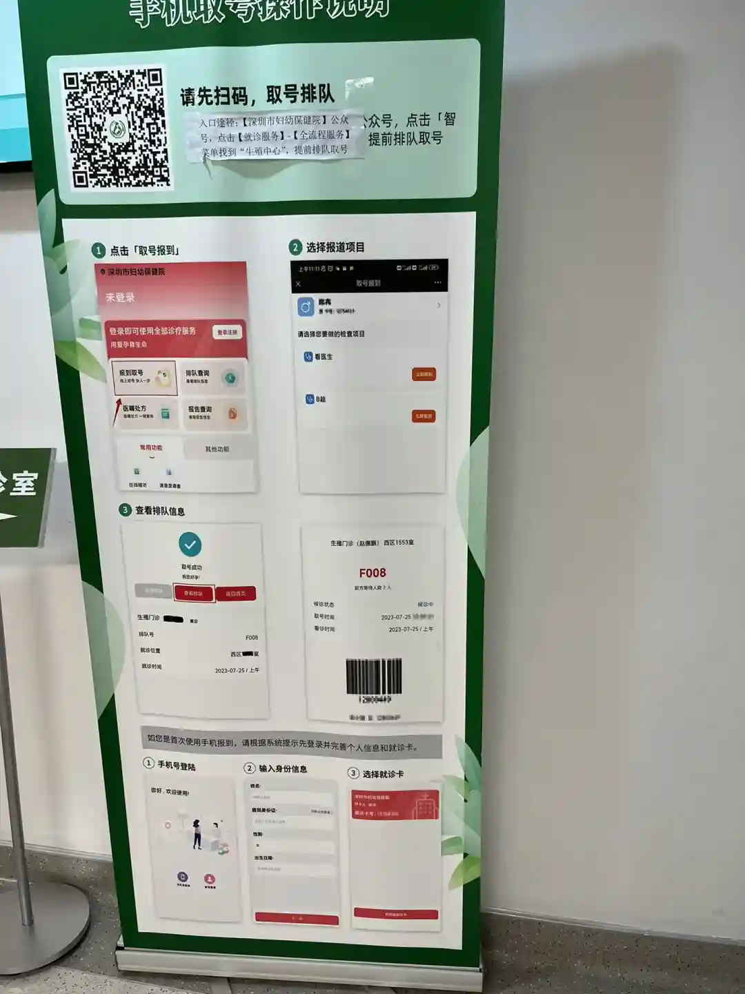 2: 签到,取号完之后你会看到一个排队号,但那不是真正的看医生的排队号,特别坑,有不少姐妹傻傻等,需要在签到机上签到才会真正排上看医生的队,才会显示到大屏幕上的。也可通过市妇幼公众号-全流程服务-生殖中心-自助报道,点看医生,也是可以排上队的。这里特别注意,看B超和看医生是冲突的,点了看医生就排不了B超的队,排了B超的号就排不了医生的号。如果已经点了看医生排上号了,又点了看B超,号会直接消失,此时可以找护士站弄回来。