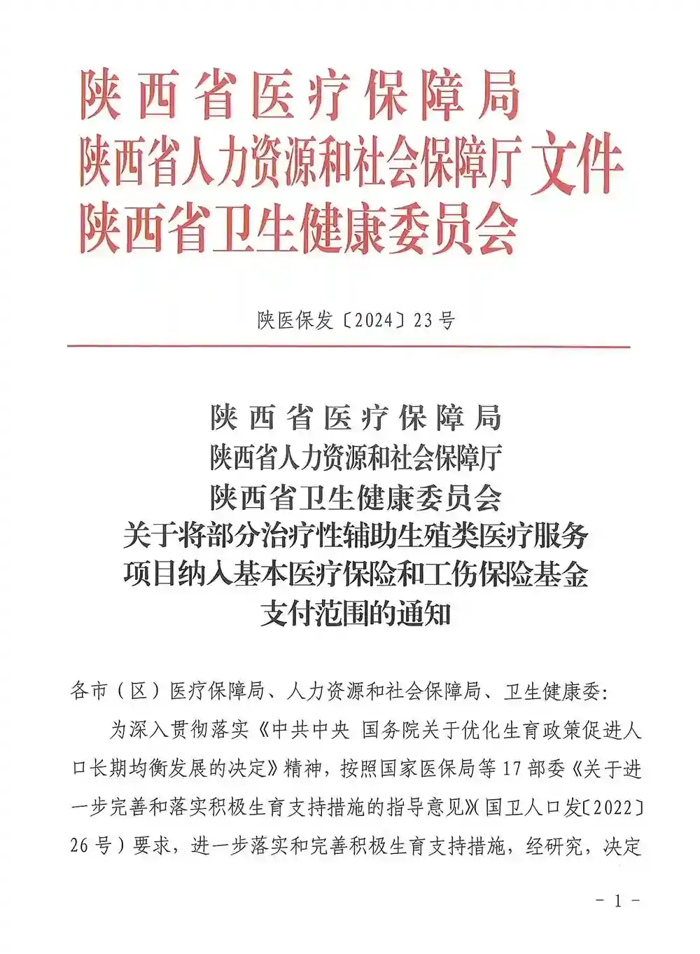 陕西省医疗保障局、省人力资源和社会保障厅、省卫生健康委员会印发《关于将部分治疗性辅助生殖类医疗服务项目纳入基本医疗保险和工伤保险基金支付范围的通知》(陕医保发〔2024〕23号)