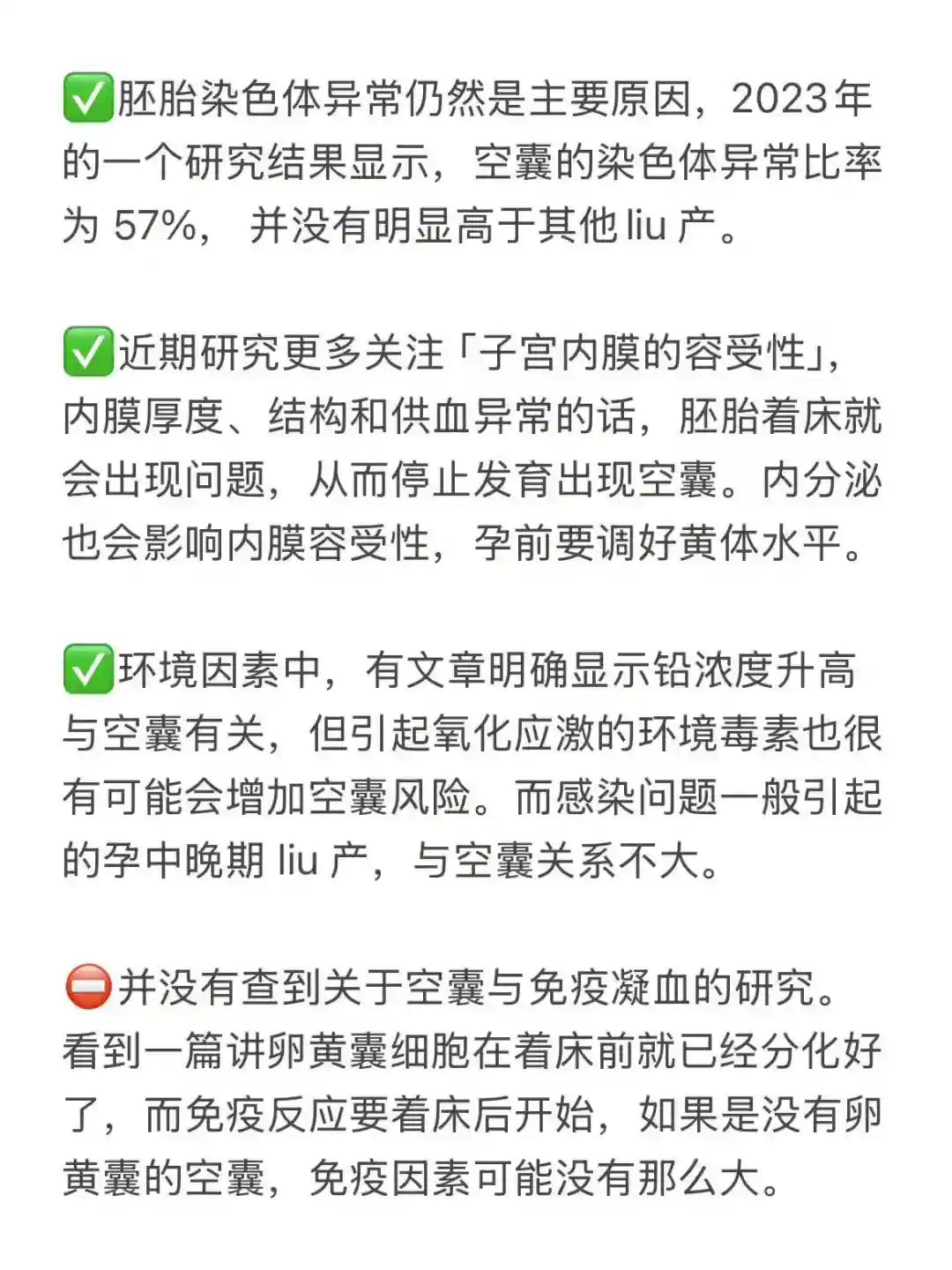也就是说,空囊大于50%的概率是胚胎有问题,如果胚胎没有问题,母体问题中更值得关心的是内分泌问题和子宫内膜容受性,因为空囊应该是在着床前或者着床时出了问题,内分泌和内膜容受性对着床影响比较大,而免疫、凝血和感染主要影响的是着床后阶段。