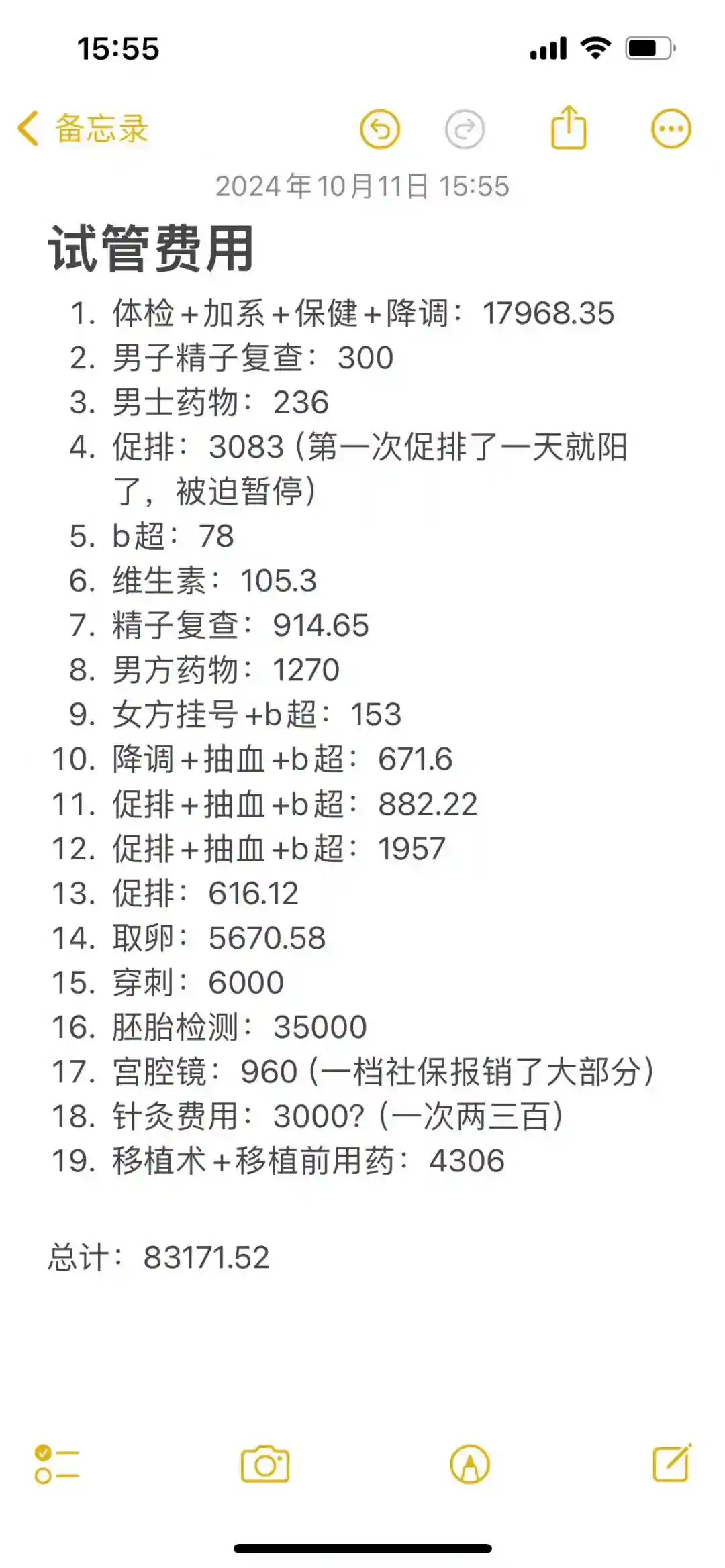 如果一切顺利,三代一个周期耗时大概2-3个月左右。一个周期的金额大约8-10万,我个人记录的耗费是8.3万(图三),但还有一些检查费特需费以及中药费没算,不算移植成功后的保胎费我应该花了10万左右。想告诉大家的是关于三代的价格有很大的不确定性,比如养出来的胚胎越多,基因染色体的筛查费用就会越高,又或者促排结果不理想需要反复促排,反复取卵,又或者囊胚没有过筛的,则又需要重头来一次,这些因素都极大的影响价格,所幸在广东三代已经纳入医保,某些项目可以报销部分。所以大家需要衡量一下自己的经济条件,因为哪怕移植成功,如果面临保胎需要上蛋白,也是一笔钱。一次6-7k,我打了8次,这里就5、6万了。