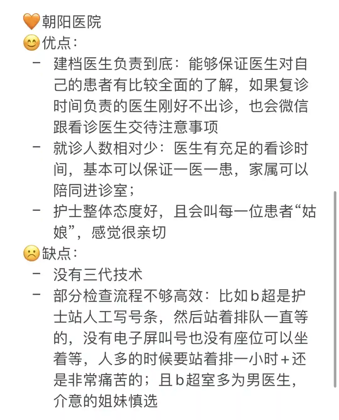 - 部分检查流程不够高效:比如b超是护士站人工写号条,然后站着排队一直等的,没有电子屏叫号也没有座位可以坐着等,人多的时候要站着排一小时+还是非常痛苦的;且b超室多为男医生,介意的姐妹慎选