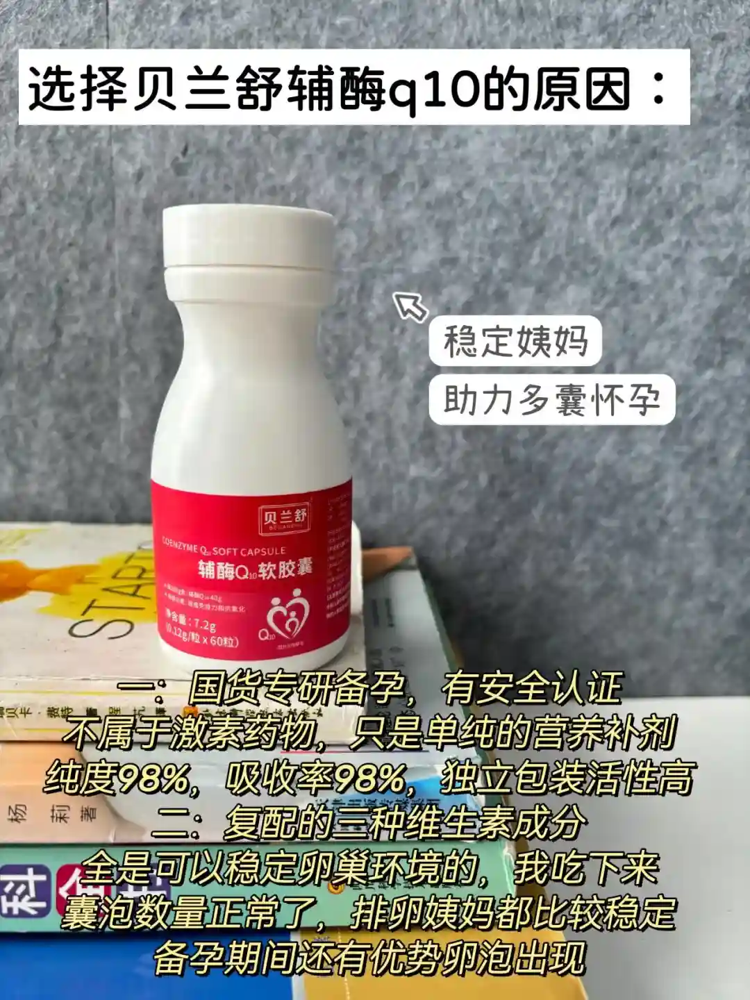 【3】⚠光靠食补不够,也要坚持内服,研究表明,补充辅酶q10是多囊备孕的关键。我一直坚持吃的贝兰舒辅酶,里面添加了生育酚、橄榄油等滋养卵巢的成分,能助力囊泡排出,加速多囊怀孕。