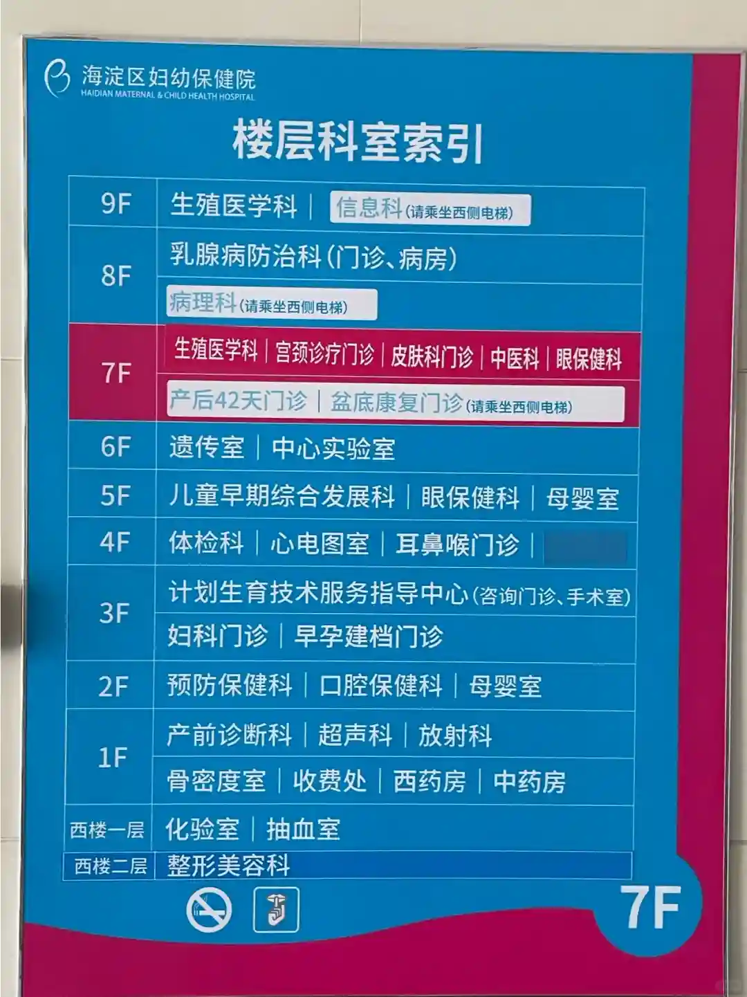 北京市海淀区妇幼保健院有2个院区,分别是本部院区(茶棚院区)、东南院区,如果选择生殖中心就诊,那需要去东南院区,茶棚院区是没有生殖中心的。乘坐地铁10号线到苏州街G口出步行200米即到,生殖中心位置是在7层和9层。详见图2和图3。