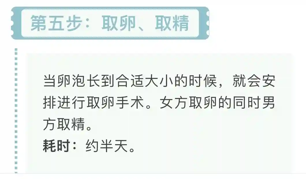 当卵泡长到合适大小的时候,就会安排进行取卵手术。女方取卵的同时男方取精。耗时:约半天。