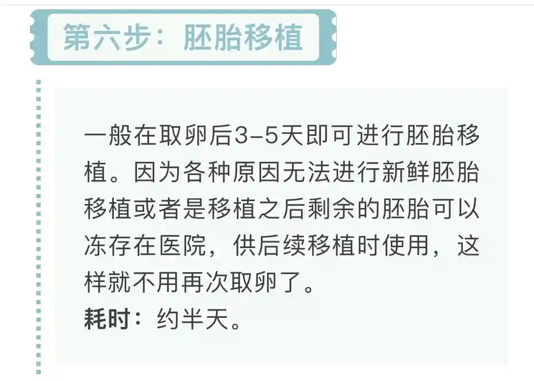 一般在取卵后3-5天即可进行胚胎移植。因为各种原因无法进行新鲜胚胎移植或者是移植之后剩余的胚胎可以冻存在医院,供后续移植时使用,这样就不用再次取卵了。
