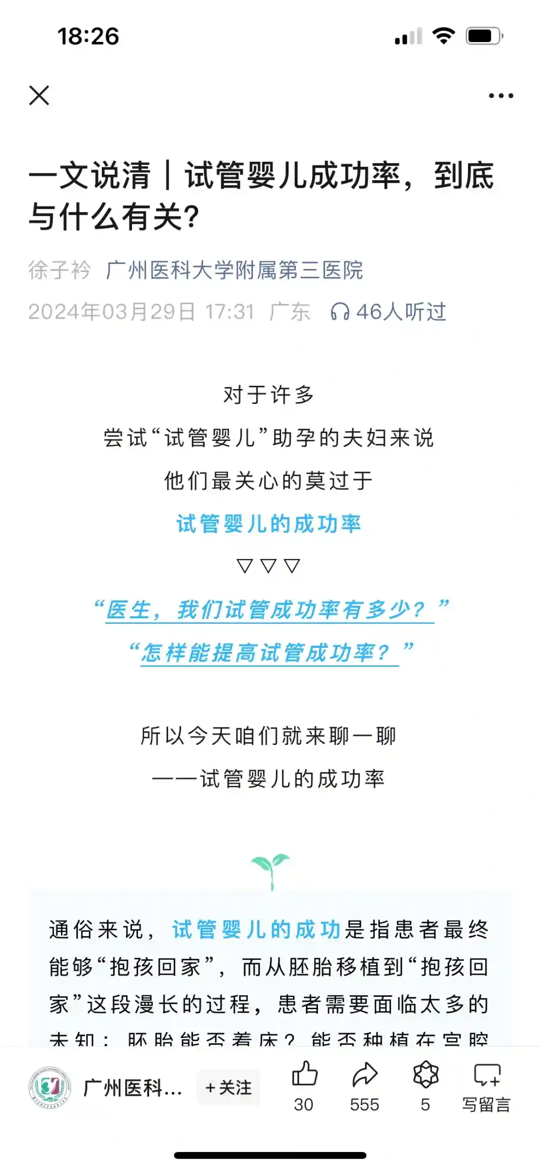 但我想跟姐妹们说的是,医院的成功率其实真的只是参考!太多的因素影响了你是否能试管成功,2024年3月广医三院就发表了一篇文章详细说了影响试管成功的因素,我把它贴了上来: