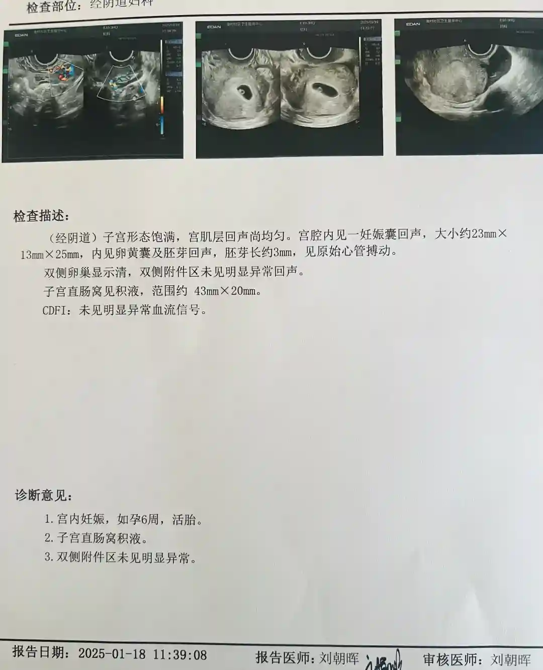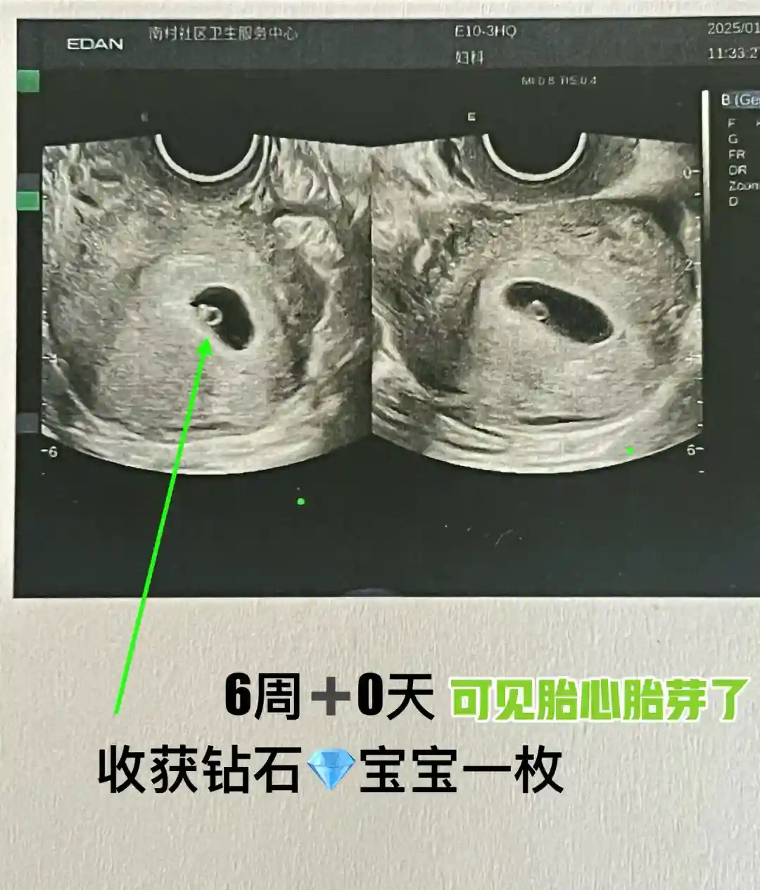 今天孕6周➕0天,才去做第一次产检,由于有过2次不良孕史,挺担心的,所以特意找医生开了腹部B超,结果说尿液太少看不到,又重新换了Y道B超,超级紧张,医生很温柔,进去后立马就看到了,开心道:呀!长的非常好呀,像颗小钻石了,放心吧放心哈