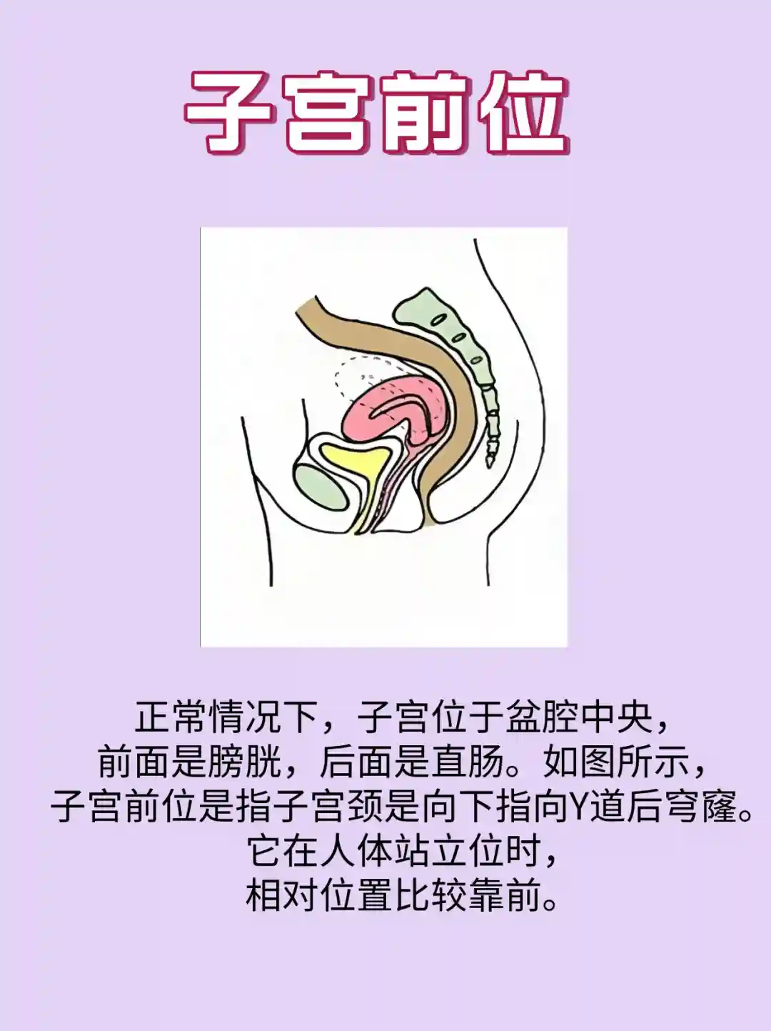 正常情况下,子宫位于盆腔中央,前面是膀胱,后面是直肠。如图所示,子宫前位是指子宫颈是向下指向Y道后穹窿。它在人体站立位时,相对位置比较靠前。