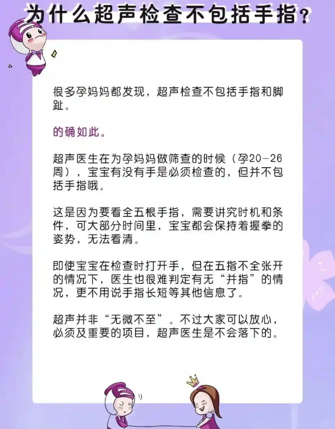 很多孕妈妈都发现,超声检查不包括手指和脚趾。