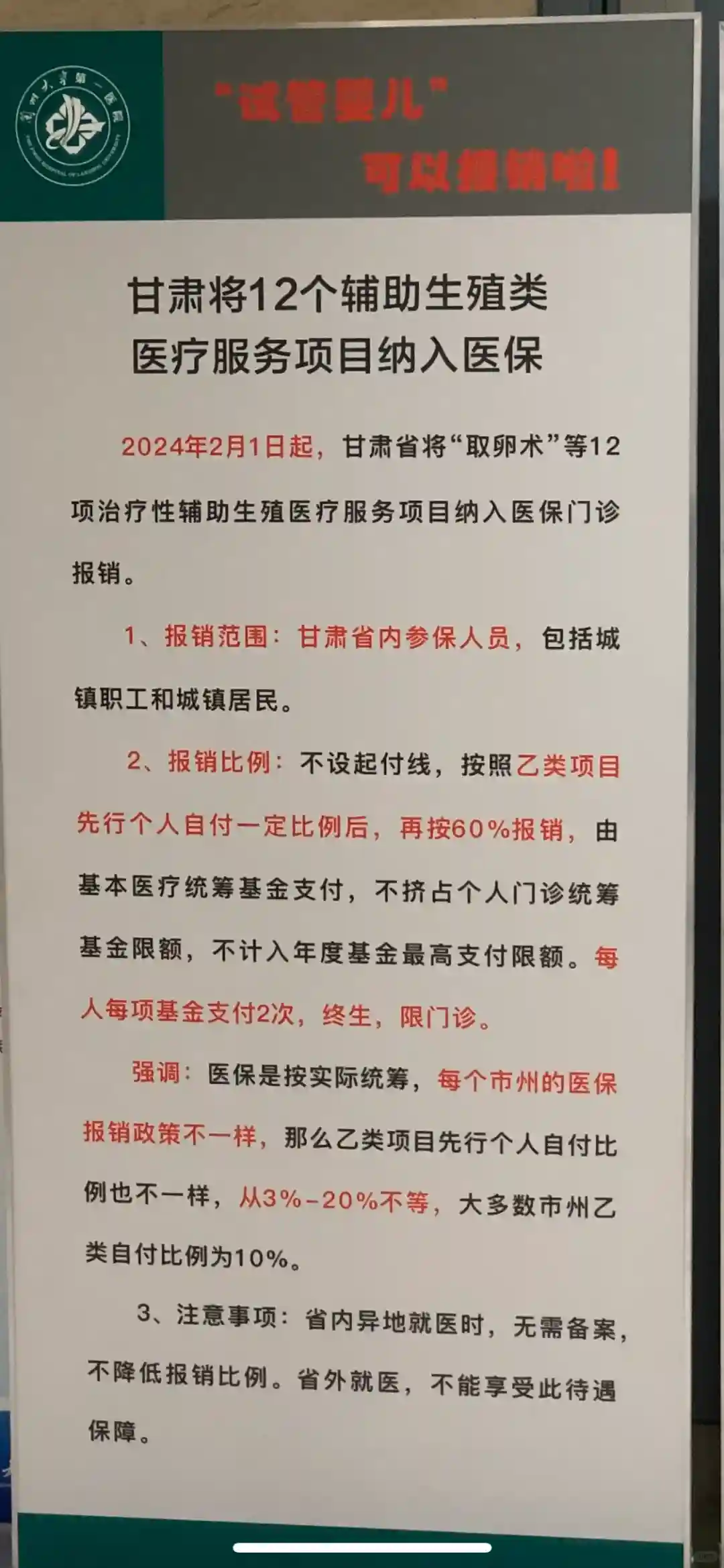 甘肃是继北京、广西、内蒙后第四个将试管婴儿纳入医保报销的省份。因为我去年转为外省医保,我所在省份的异地就医报销政策是报销项目参照就医所在地报销项目,报销比例参照医保所在地报销比例。起初我对政策的解读,只要兰州的试管项目纳入医保,就可以以医保所在地报销比例进行报销。但是随着甘肃省及兰大一院的一些政策解读,外省医保不在报销范围内。其实我内心已经默认。但是,我每一次都会去人工缴费窗口缴费,因为你不清楚的医保政策及比例等等问题,在你刷了医保卡/码的时候系统就给你算的明明白白了。