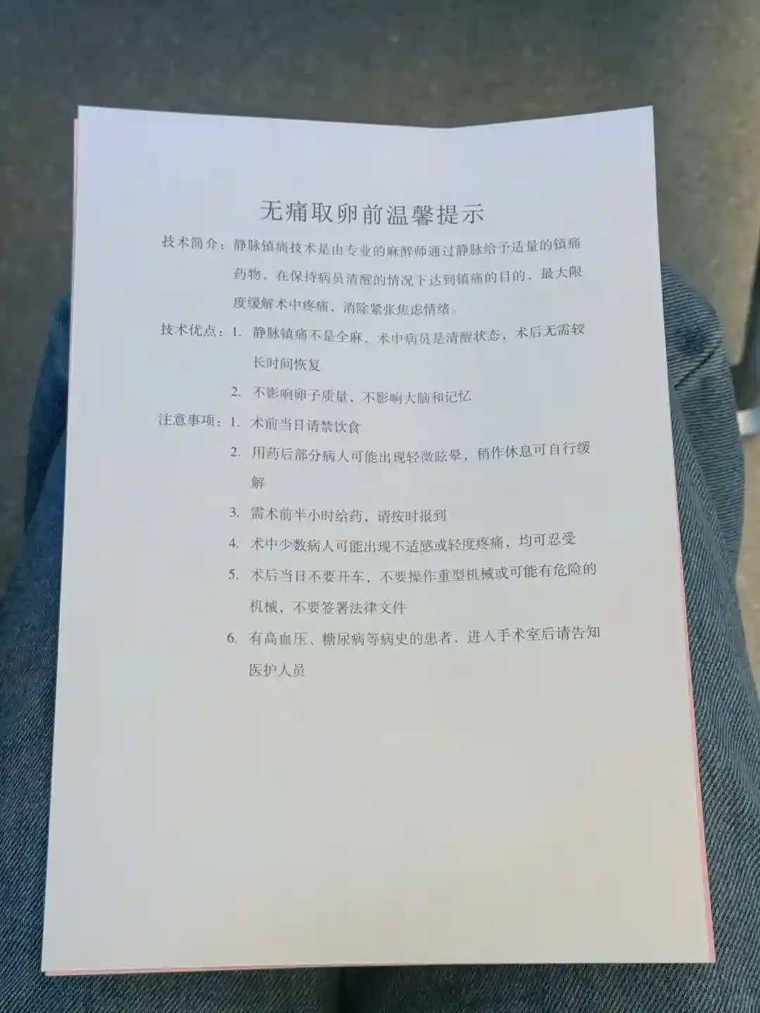 上午7:30不吃不喝‼️准时到取卵楼层➡️🧑⚕️逐一叫名字前台检查是否已成功缴费,挂号点签到➡️带好自己的病历本在门口,把鞋脱到外边,按指纹进手术室➡️换拖鞋,带手术帽,换手术服➡️大夫会在里边给大家统一讲注意事项➡️逐一进行Di2️⃣遍冲洗(反正我是挺紧张的,感谢大夫👩⚕️跟我聊了聊,缓解一下心情❤️🩹)➡️再排队去扎打麻药的滞留针(针头很粗,有点痛)➡️自己去签麻醉协议✍️