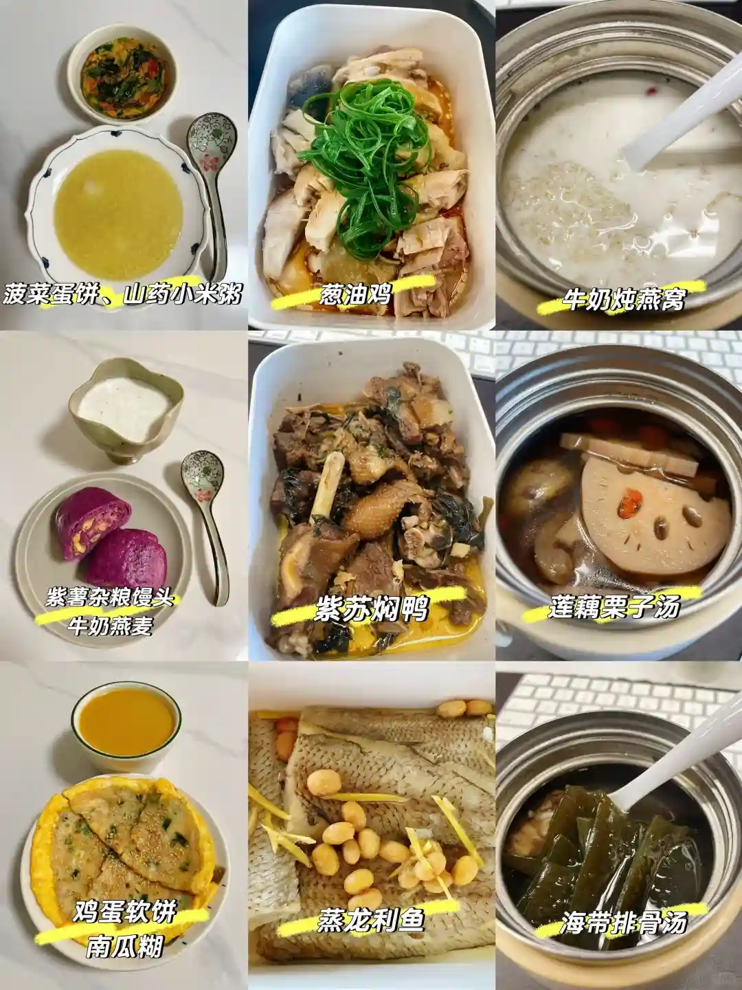 4⃣️ 菠菜蛋饼+小米山药粥、葱油鸡、牛奶炖燕窝