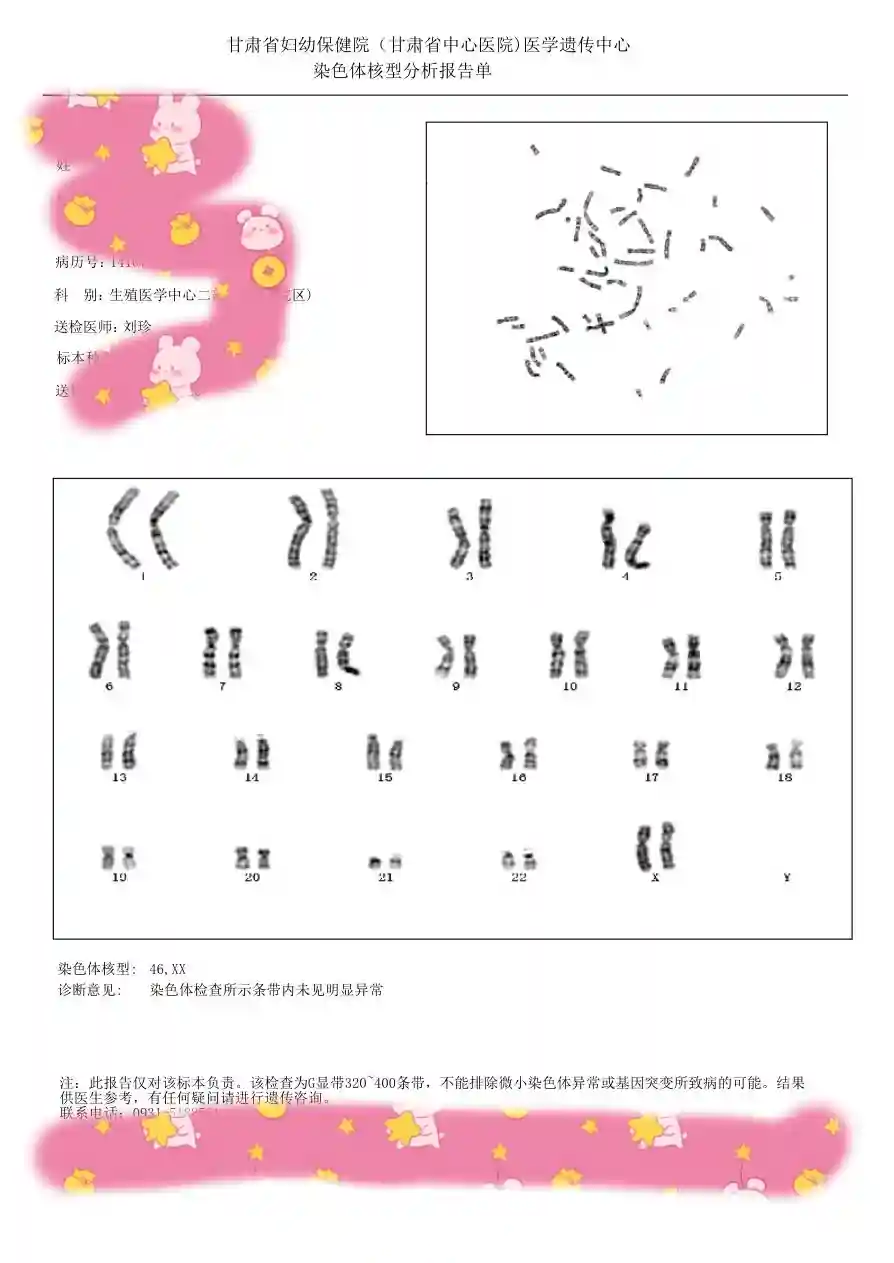 这次去做了全面的检查,这个是双方染色体检查,等待结果的过程很漫长,心里也很忐忑。就怕最后走上三代试管的道路上。但是好在我们都没有问题。