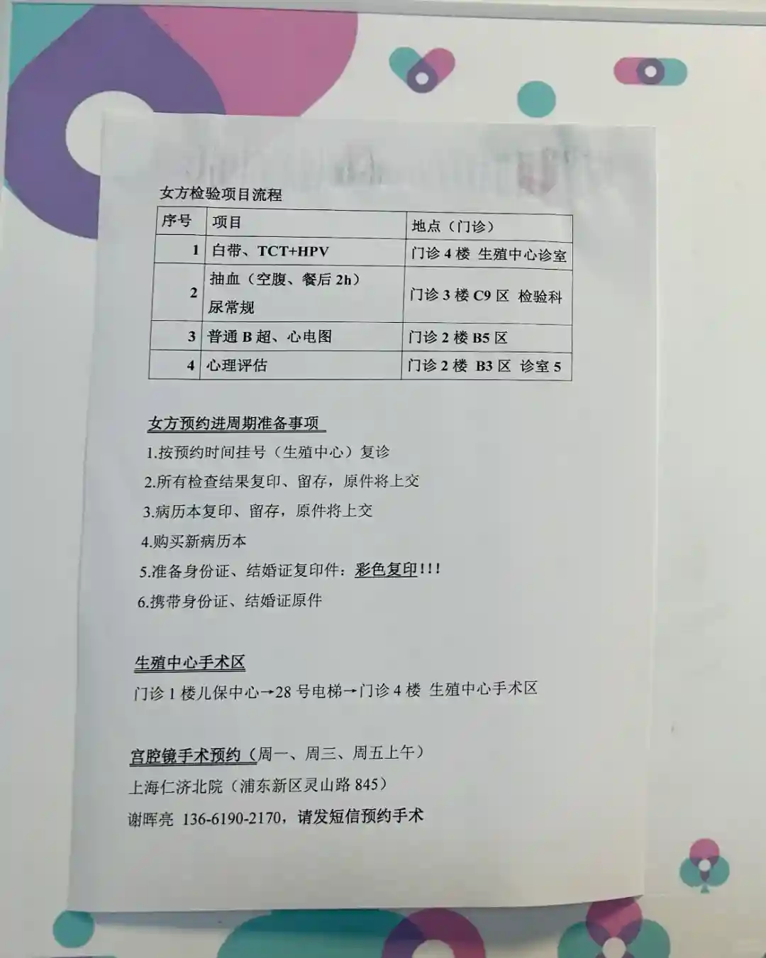 第二次叫号是陈主任亲自沟通。还没想好要调理or人授or试管的姐妹,可以多咨询一下。因为我已经决定做试管了,所以直接敲定了周五一早,男女双方空腹来做全套检查。TIPS1:其他医院的检查单只要在有效期内,可以不用重复做。比如血型、染色体永久有效,TCT、HPV是一年。