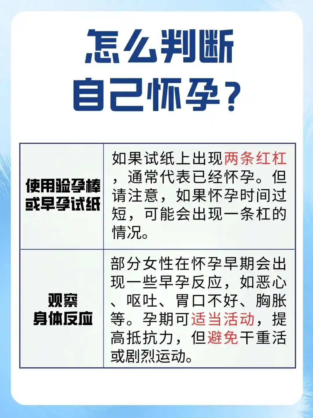 💡 我想对所有关心怀孕问题的朋友们说:可以使用验孕棒或早孕试纸,如果试纸上出现两条红杠,通常代表已经怀孕。同时也要观察身体反应,如恶心、呕吐、胃口不好、胸胀等来判断自己是否怀孕。祝愿每一位准妈妈都能度过一个健康、愉快的孕期!