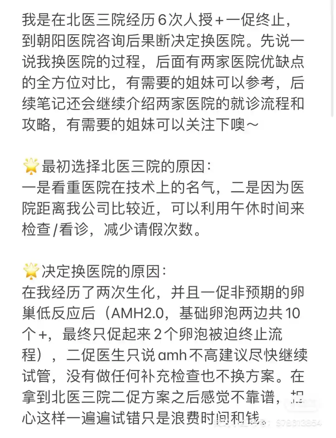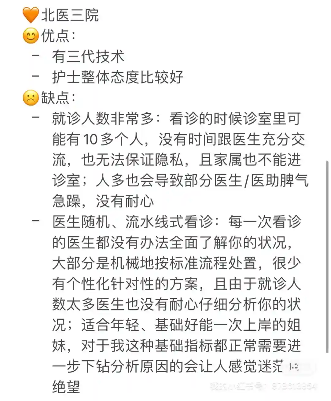 - 医生随机、流水线式看诊:每一次看诊的医生都没有办法全面了解你的状况,大部分是机械地按标准流程处置,很少有个性化针对性的方案,且由于就诊人数太多医生也没有耐心仔细分析你的状况;适合年轻、基础好能一次上岸的姐妹,对于我这种基础指标都正常需要进一步下钻分析原因的会让人感觉迷茫且绝望