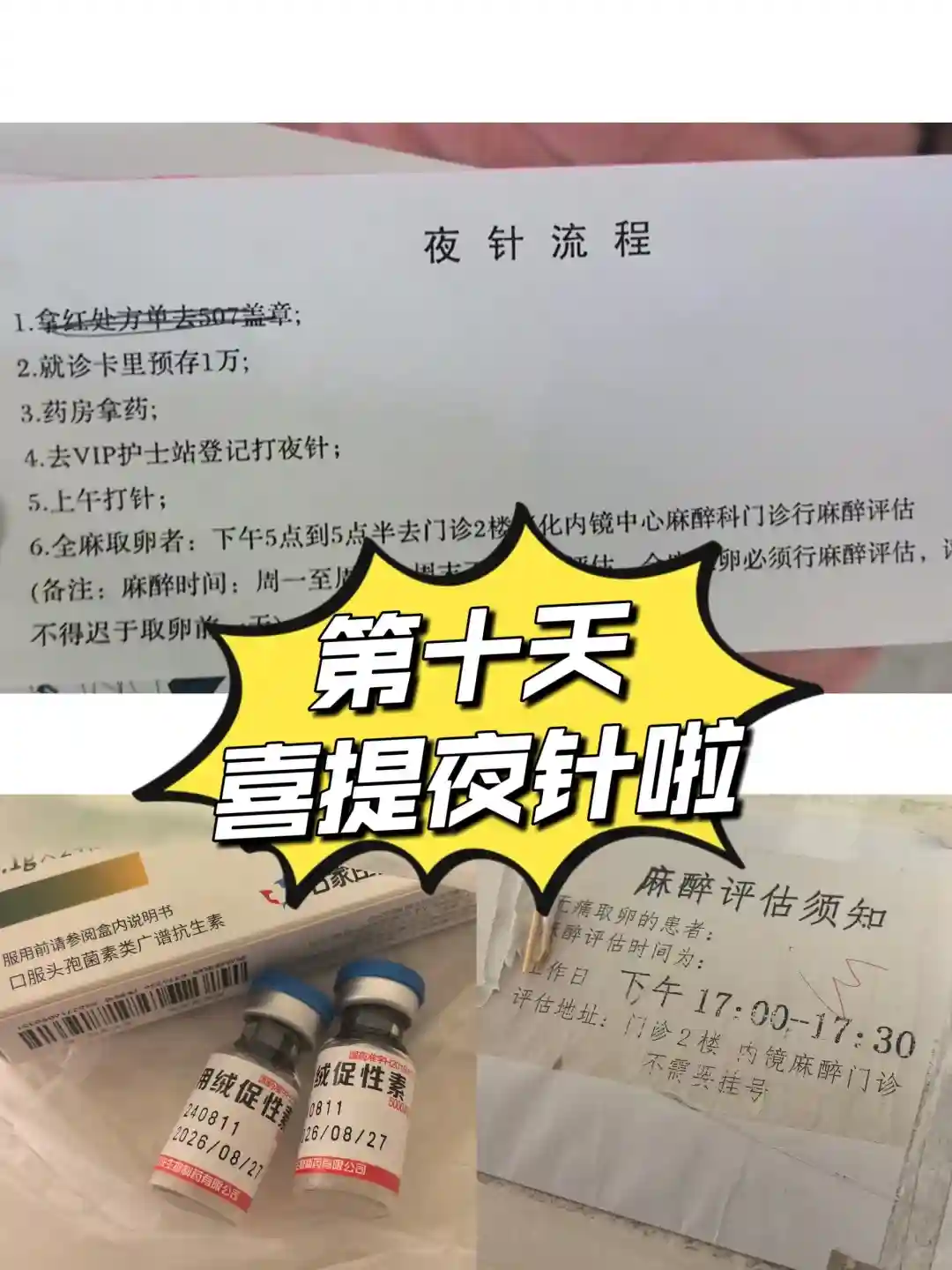 促排期间医生会根据卵泡 雌激素告诉你什么时候可以打夜针,这个环节很重要 卵泡长的差不多了 去医院的频率就高一点 因为要监测 怕提前排出就白白打针了,我第8、9天就是每天去的,上午的B超和血检出来医生上午就会告诉你当天是否可以打夜针,然后会给你打夜针取卵须知单和夜针流程单(如图所示)。