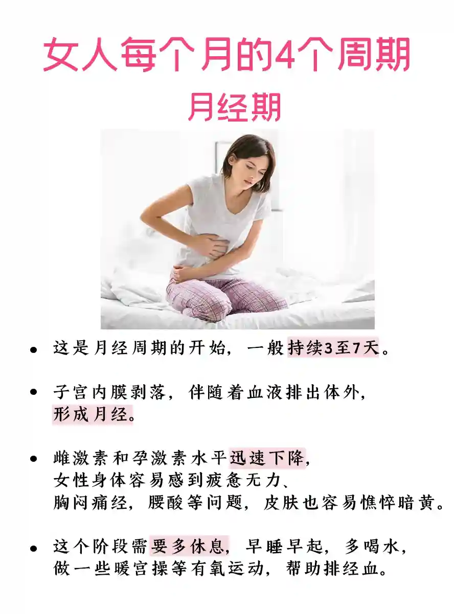 生理特点:体内雌激素和孕激素水平急剧下降,子宫内膜剥落,可能伴有痛经、乏力、腰酸等不适症状。
