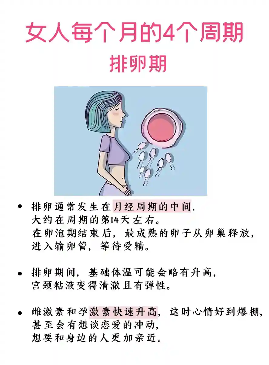 生理特点:雌激素水平达到高峰,促使卵子排出,同时宫颈黏液变得稀薄,有利于精子通过。