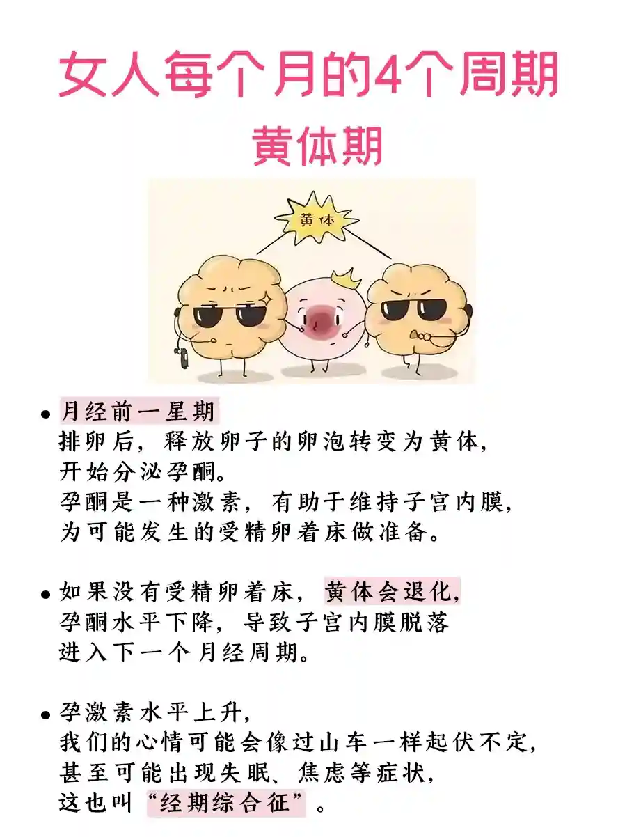 心情变化:在黄体期的前期,女生的情绪相对稳定,但随着孕激素水平的升高,可能会出现情绪波动,如焦虑、紧张、易怒等,还可能伴有乳房胀痛、腹胀、疲劳等身体不适,这些都可能影响心情,使女生变得更加敏感和情绪化。