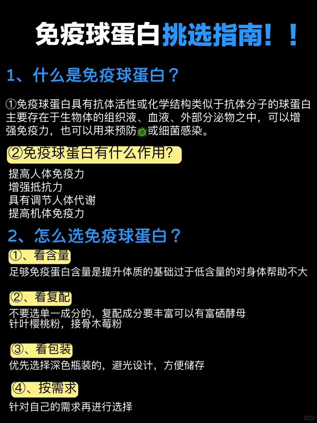 ①看含量:足够免疫蛋白含量是提升体质的基础,过于低含量的对身体帮助不大②看复配:不要选单一成分的,复配成分要丰富,可以有富硒酵母,针叶樱桃粉,接骨木莓粉