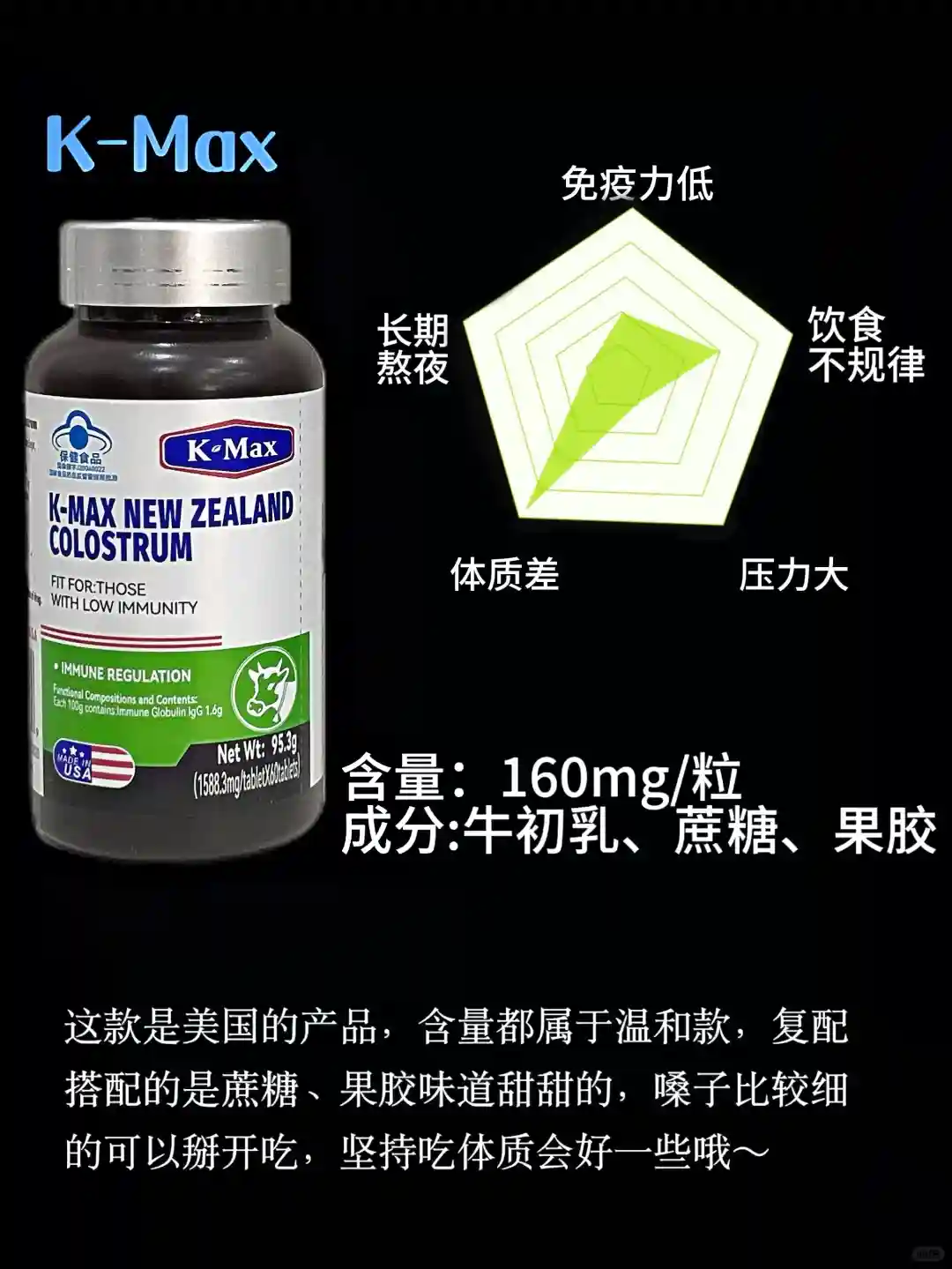 牛初乳+蔗糖+果胶的组合,含量温和,味道甜甜的,嗓子眼比较细的可以掰开吃,瓶子避光设计方便保存。