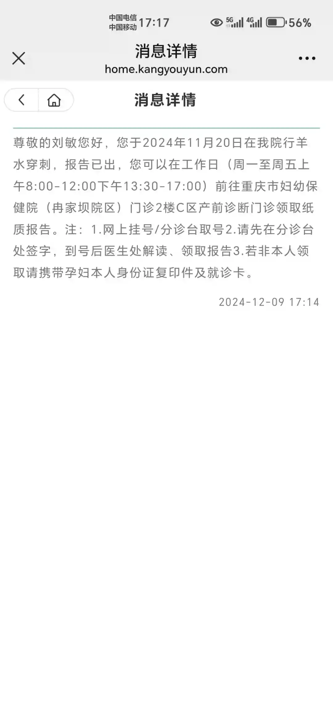#羊穿翻盘距离接到无创电话已经 27天了,羊穿后的20天,今天收到重庆妇幼公众号推送的消息,医护人员说过,这种就是没有问题的,挑个时间去领报告就行终于有种雨过天晴的感觉,做完羊穿的第十天打电话去问了医院快速报告FISH出来没有,已经告知我们没问题,但当妈的就是全部报告没有出来完是不可能放心的,今天终于等到了好结果。回想前面经历的黑暗日子,觉得太不容易了,天天都忍不住哭,害怕结果不好,但好在,我的宝宝还是舍不得爸爸妈妈和姐姐,明年我们一起期待你的出生这里要给各位性染色体异常的姐妹加个油,宝宝没有想象中的脆弱,所以我们要相信宝宝!!