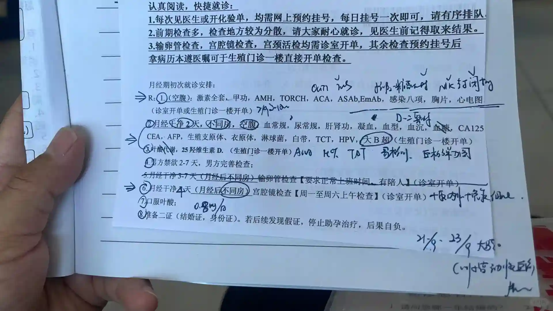 第二次:月经干净2天,空腹,(血常规,尿常规,肝肾功,凝血,血型,血沉,血糖,CA125,CEA,AFP,生殖支原体、衣原体,淋球菌,白带,TCT,HPV,大B超)+叶酸代谢,25羟维生素D。第三次:月经干净后第4天,宫腔镜检查【周一至周六上午检查】(诊室开单);