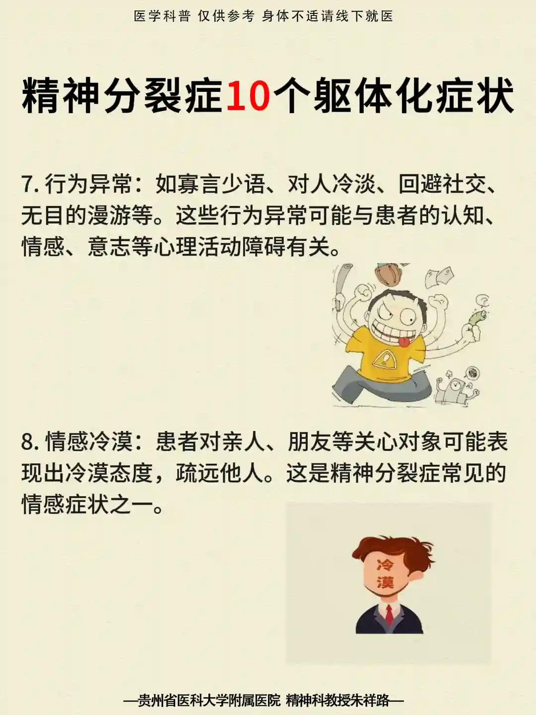 7. 行为异常:如寡言少语、对人冷淡、回避社交、无目的漫游等。这些行为异常可能与患者的认知、情感、意志等心理活动障碍有关。