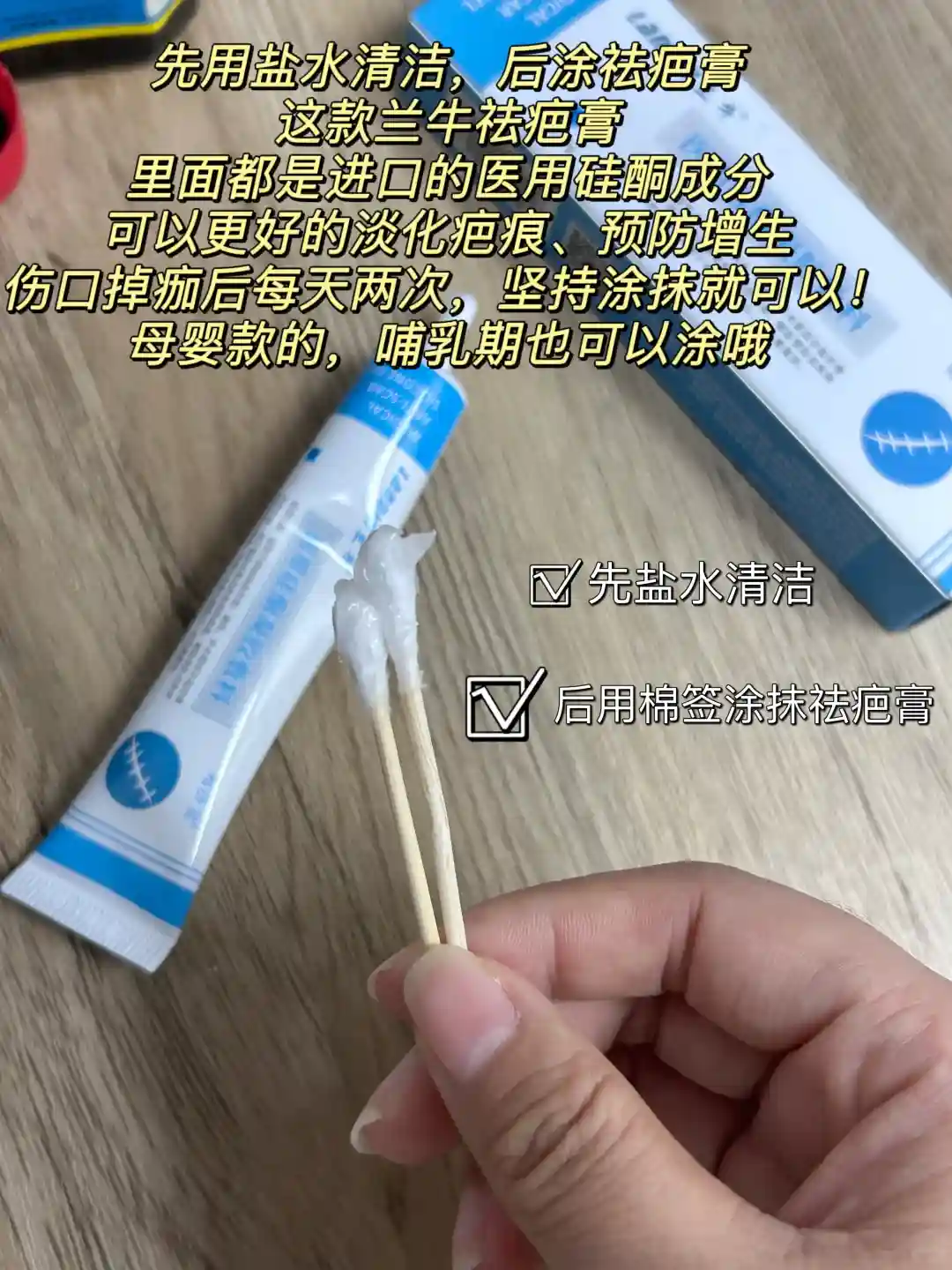 (5)• 兰牛祛疤膏:伤口结痂脱落后,可以用含有医用硅酮的祛疤膏祛疤,这个兰牛祛疤膏就是,可以很好的淡化疤痕,抑制增生,坚持涂了一段时间,疤痕就淡了!