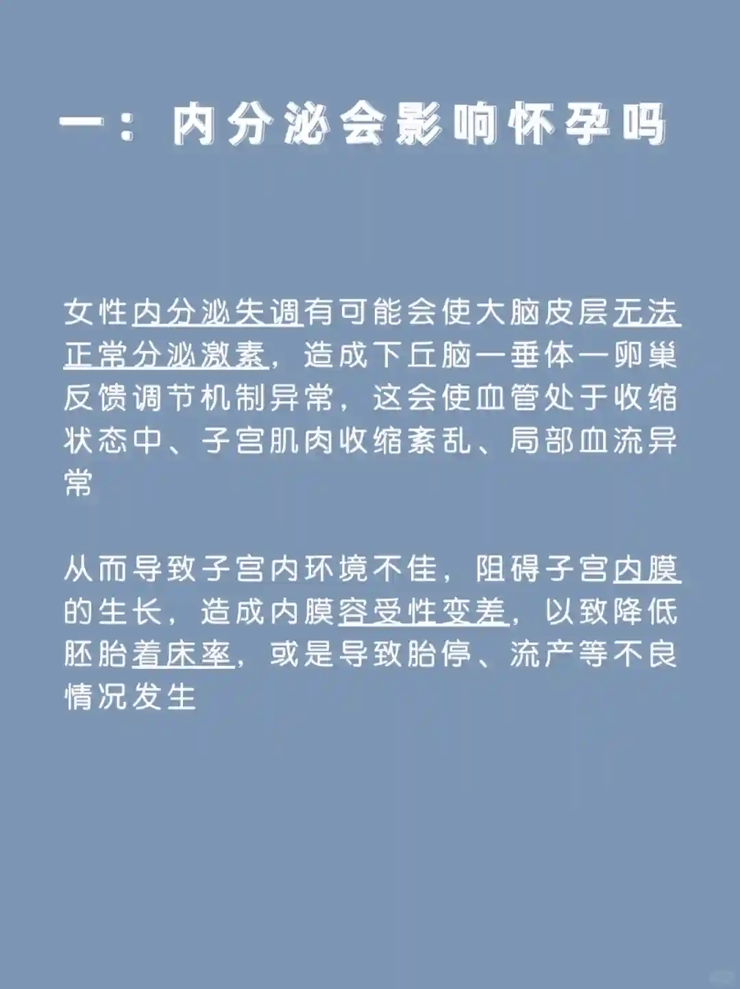女性内分泌失调有可能会使大脑皮层无法正常分泌激素,造成下丘脑—垂体—卵巢反馈调节机制异常,这会使血管处于收缩状态中、子宫肌肉收缩紊乱、局部血流异常,从而导致子宫内环境不佳,阻碍子宫内膜的生长,造成内膜容受性变差,以致降低胚胎着床率,或是导致胎停、流产等不良情况发生